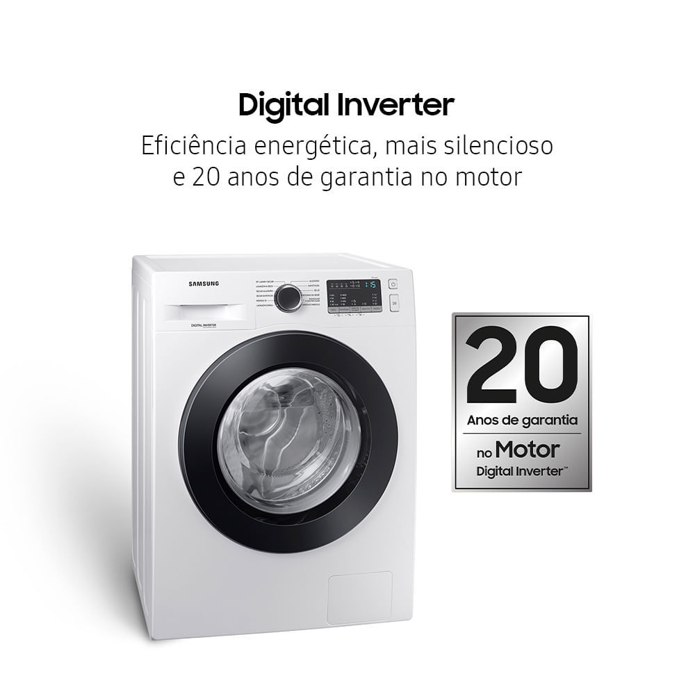 Lava, seca e esteriliza a seco 3 em 1 Roupas sempre bem cuidadas com a lavadora que lava, seca e esteriliza a seco. Com o ciclo de lavagem a seco, você elimina odores indesejáveis e até 99,9% das bactérias e alérgenos que causam problemas respiratórios, sem usar água ou sabão. Ideal para proteger sua saúde e a da sua família. Esterilização: refere-se aos ciclos de lavagem a Seco (Air Wash), que consiste em uma lavagem sem utilização de água ou produtos químicos que remove 99.9% de certas bactérias, com base no relatório de teste realizado pela Intertek. Maior economia, mais silenciosa e 20 anos de garantia Motor Digital Inverter A tecnologia Digital Inverter garante mais economia, menor nível de ruído e maior durabilidade com 20 anos de garantia no motor. Em comparação a motores não Digital Inverter. A SAMSUNG concederá, ainda, APENAS AO MOTOR principal Digital Inverter, uma garantia de 20 (vinte) anos (legal + contratual), contada a partir da data de aquisição, ou da data da entrega do produto, identificada pela Nota Fiscal de venda ao Consumidor Final do produto. Esta garantia de 20 anos não se aplica aos demais componentes do produto ou aos custos de mão de obra. Fica coberta pela garantia total de 20 (vinte) anos apenas o MOTOR principal Digital Inverter. Garantia válida somente na rede autorizada da marca. Praticidade e rapidez Lavagem rápida em 15min e Lava e Seca em 59min A WD11M lava e centrifuga as roupas em 15min no ciclo rápido destinado a pequenas cargas, com sujeira leve. Ela ainda possui um ciclo de lavagem e secagem de 59min para garantir mais praticidade e tempo pra você. Lavagem rápida em 15"": Para peças levemente sujas com menos de 2 kg. Lava e Seca em 59"": Cargas de menos de 1 kg. Carga recomendada de 3 a 4 camisetas ou camisas de algodão e poliéster (composição do tecido: 35% algodão / 65% poliéster). Sua máquina sempre limpa Lavagem do Tambor Eco Mantenha sua máquina limpa de maneira ecológica. A Lavagem do Tambor Eco remove 99,9% das bactérias causadoras de odor do tambor sem usar produtos químicos e ainda ajuda na manutenção do seu produto. E você ainda recebe uma notificação de quando a sua máquina precisa ser limpa. Remoção de 99,9% das bactérias: baseado no relatório do ciclo Lavagem do Tambor Eco realizado pela Intertek. Elimina até 99.9% das bactérias de dentro da lavadora. Notificação: fornece uma notificação a cada 40 ciclos. Delicadeza para proteger os tecidos Diamond Drum O design do tambor da lava e seca Samsung é delicado com as suas roupas. Seus pequenos orifícios em formato de diamante também ajudam a proteger os tecidos, reduzindo o atrito e prevenindo que suas roupas desfiem durante a lavagem. Remove os resíduos Dispenser sempre limpo O dispenser projetado com um sistema de passagem de água facilita a saída do sabão, mantendo-o limpo e evitando desperdício de insumos.