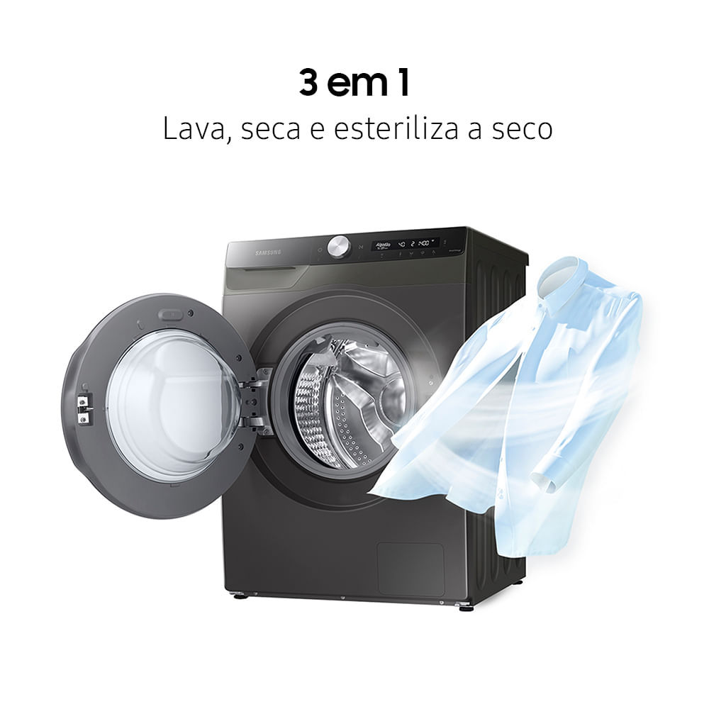 Lavagem inteligente AI Control + SmartThings A lavagem de roupas acaba de ficar mais inteligente. Com um painel de controle intuitivo, essa máquina de lavar inteligente e conectada identifica os hábitos de lavagem da sua família e recomenda os seus ciclos favoritos. Ela ainda exibe durante a lavagem as informações mais importantes. Quer tornar o processo ainda mais simples? Com o app SmartThings você pode programar o horário da sua lavagem, obter dicas e recomendações do ciclo ideal, e até mesmo receber ajuda para conservar sua máquina. App SmartThings: disponível em dispositivos Android e iOS. Uma conexão Wi-Fi e uma conta Samsung são necessárias. Imagens ilustrativas, pode haver diferenças. Imagens da interface do usuário podem variar. AI Control Entende seus hábitos Display informativo SmartThings Receita de lavagem Recomendação dos ciclos mais indicados Planejamento de lavagem Planejamento da lavagem pelo celular Assistente Personalizado Autodiagnóstico e manutenção Recomendação baseada na temperatura e localização Recomendação do ciclo com base nas condições do tempo Lava, seca e esteriliza a seco 3 em 1 Roupas sempre bem cuidadas com a lavadora que lava, seca e esteriliza a seco. Com o ciclo de lavagem a seco AirWash, você elimina odores indesejáveis e até 99,9% das bactérias e alérgenos que causam problemas respiratórios, sem usar água ou sabão. Ideal para proteger sua saúde e a da sua família. Esterilização: refere-se aos ciclos de lavagem a Seco (Air Wash), que consiste em uma lavagem sem utilização de água ou produtos químicos que remove 99.9% de certas bactérias, com base no relatório de teste realizado pela Intertek. Bolhas poderosas Ecobubble™ A tecnologia exclusiva Ecobubble™ produz bolhas de sabão que tornam a lavagem muito mais cuidadosa e poderosa. Ela facilita em 40x a penetração do sabão no tecido e promove uma lavagem mais eficaz mesmo com água fria e com mais economia de energia. Facilita em 40x a penetração do sabão no tecido: testado em conformidade com a IEC 60456-2010/4kg de carga de lavagem/Super Eco Wash a frio (WF80F5E5U4W) contra algodão a 40 °C sem EcoBubbleTM (WF0702WKU). Resultados individuais podem variar. Baseado no relatório do teste de desempenho feito em laboratório pela Springboard Engineering em tiras de EMPA, comparando uma solução de detergente normal e tecnologia de bolhas sem ação mecânica. Maior economia, mais silenciosa e 10 anos de garantia Motor Digital Inverter A tecnologia Digital Inverter garante mais economia, menor nível de ruído e maior durabilidade com 10 anos de garantia no motor. Em comparação a motores não Digital Inverter. A SAMSUNG concederá, ainda, APENAS AO MOTOR principal Digital Inverter, uma garantia de 10 (vinte) anos (legal + contratual), contada a partir da data de aquisição, ou da data da entrega do produto, identificada pela Nota Fiscal de venda ao Consumidor Final do produto. Esta garantia de 10 anos não se aplica aos demais componentes do produto ou aos custos de mão de obra. Fica coberta pela garantia total de 10 (vinte) anos apenas o MOTOR principal Digital Inverter. Garantia válida somente na rede autorizada da marca. Limpeza profunda com vapor eliminando 99,9% de bactérias Vapor de higiene Higienize suas roupas com o poderoso ciclo de vapor que libera ar quente, removendo sujeiras profundas e 99,9% das bactérias e alérgenos inativos. Remoção de 99,9% das bactérias e alérgenos inativos: baseado no relatório do teste de comportamento do vapor de higiene da Intertek. Remove 99.9% de certas bactérias, incluindo Staphylococcus aureus e Escherichia coli. Resultados individuais podem variar. Sua máquina sempre limpa Lavagem do Tambor Mantenha sua máquina limpa de maneira ecológica. A Lavagem do Tambor remove 99,9% das bactérias causadoras de odor do tambor sem usar produtos químicos e ainda ajuda na manutenção do seu produto. E você ainda recebe uma notificação de quando a sua máquina precisa ser limpa. Remoção de 99,9% das bactérias: baseado no relatório do ciclo Lavagem do Tambor realizado pela Intertek. Elimina até 99.9% das bactérias de dentro da lavadora. Notificação: fornece uma notificação a cada 40 ciclos. Praticidade e rapidez Lavagem rápida em 15 minutos A WD11T lava e centrifuga as roupas em 15 minutos no ciclo rápido destinado a pequenas cargas, com sujeira leve. Lavagem rápida em 15 minutos: para peças levemente sujas com menos de 2kg. Delicadeza para proteger os tecidos Diamond Drum O design do tambor da lava e seca Samsung é delicado com as suas roupas. Os pequenos relevos em formato de diamante do tambor também ajudam a proteger os tecidos, reduzindo o atrito e prevenindo que suas roupas desfiem durante a lavagem. Lavagem intensiva para as manchas mais difíceis Função Manchas Difíceis A função Manchas Difíceis ajuda a remover uma grande variedade das manchas mais difíceis. Ao selecionar essa função, as peças de roupas são colocadas completamente de molho em água com bolhas para uma lavagem mais eficaz. Função Manchas Difícei