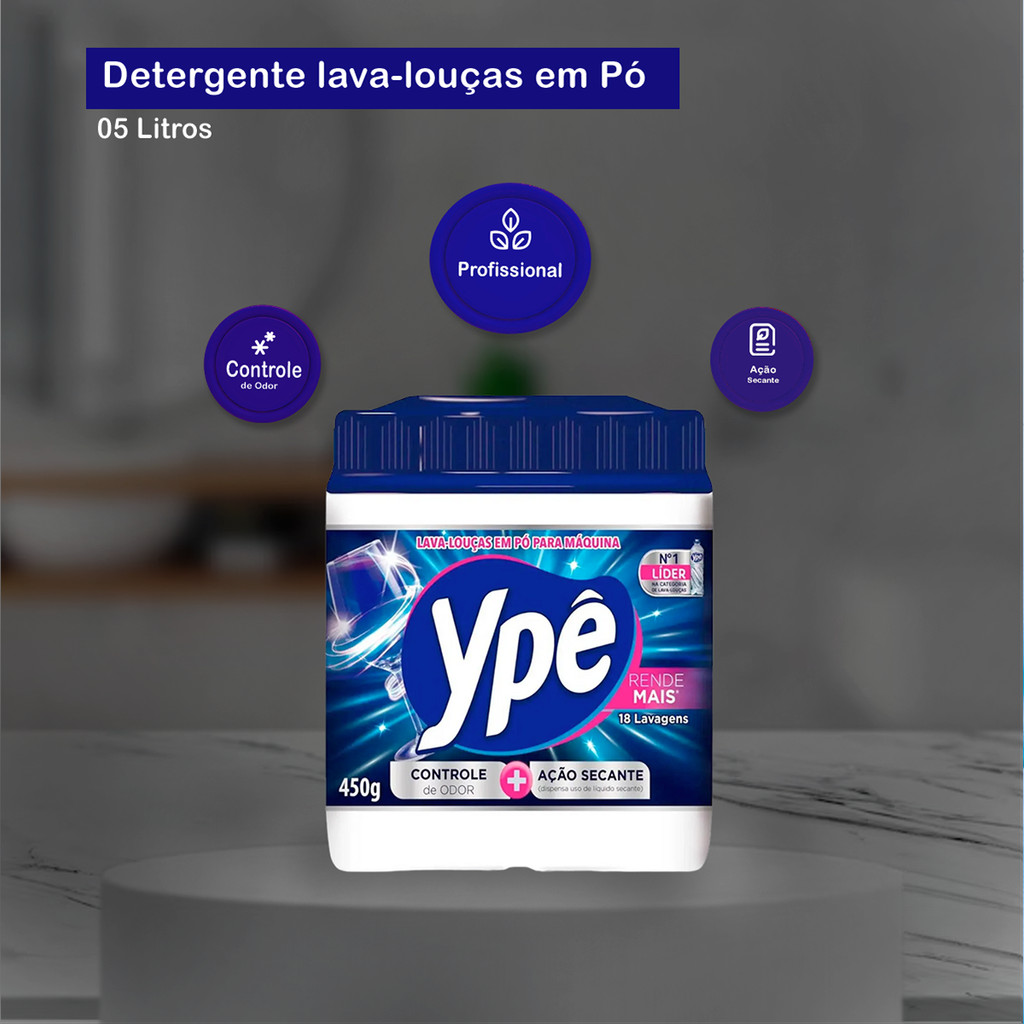 Lava Louças em Pó para Máquina 450g Ypê O lava-louças que conquistou os lares dos brasileiros apresenta uma nova opção para a lavagem da louça: o Lava-Louças em Pó para Máquina Ypê. Sua exclusiva fórmula, com alta eficiência e ação secante, dispensa o uso do líquido secante/abrilhantador e é o único do mercado a oferecer controle de odor das louças e da máquina. Além de dispensar a pré-lavagem, com enzimas e oxigênio ativo, limpa as sujeiras mais difíceis e rende mais: 18 lavagens, pois a dosagem necessária por ciclo de lavagem é menor, sendo mais econômico. Praticidade, economia de tempo e a garantia de qualidade dos produtos com a marca Ypê. Na hora de lavar louças, não tenha dúvidas, escolha a marca líder Embalagem: 01 unidade de 450g cada