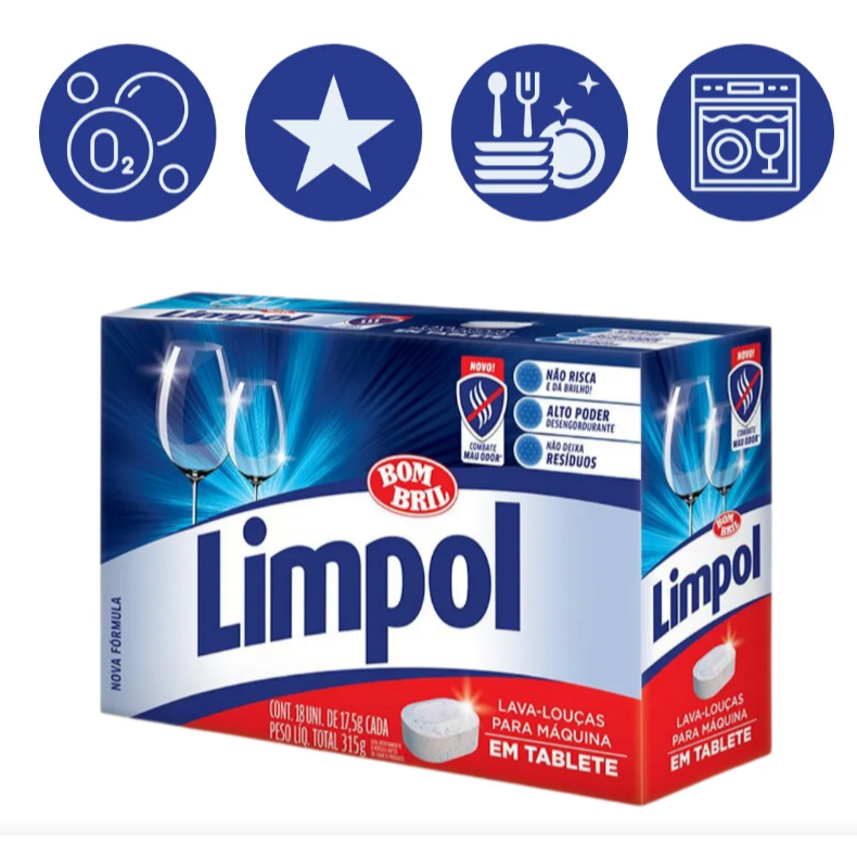 Lava-Louças Limpol em Tabletes para Máquina de Lavar, embalagem com 315 gramas contém 18 tabletes de 17,5 gramas cada, garante uma limpeza com qualidade e alta performance. Possui fórmula equilibrada e eficiente que remove as gorduras e sujeiras das louças, além de ser fácil e prático de usar. Modo de uso: Coloque o tablete no reservatório da máquina e pronto, sua louça estará limpa e bem cuidada.