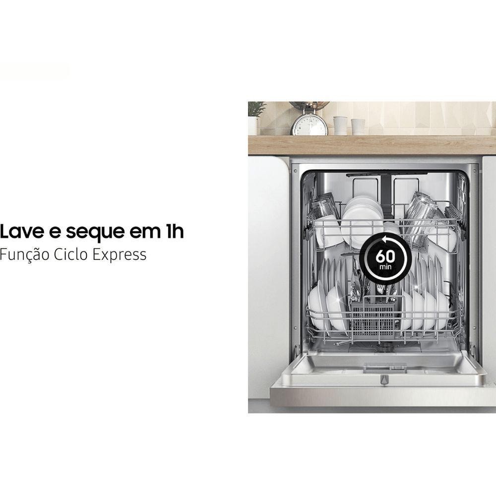 Lava-louças Samsung Inox 14 Serviços 110v Dw60c7050fs/azA Lava-Louças Samsung Inox 14 Serviços 110V DW60C7050FS/AZ oferece, limpeza profunda e silenciosa, função Higiene com enxágue em alta temperatura e função Ciclo Auto que detecta o nível de sujeira nas louças. Menos barulho. Menos incômodo. Limpeza silenciosa. Evite incômodos com uma lava-louças silenciosa que emite menos de 47 decibéis. A cuba de aço inoxidável é projetada para abafar grande parte dos ruídos, absorvendo o som e a vibração quando ligada. Limpa e higieniza profundamente Função Higiene. Seus pratos, talheres e utensílios de cozinha sempre higienizados para uso. Durante o enxágue final, essa funcionalidade eleva a temperatura da água para 70C, entregando uma limpeza profunda. Louças mais limpas Função Ciclo Auto. Sua louça sempre limpa e brilhando. A função Ciclo Auto garante uma limpeza muito mais eficiente, já que ela detecta o nível de sujeira presente e seleciona automaticamente o ciclo de limpeza ideal, economizando água e energia. Lave e seque em 1h Função Ciclo Express. Economize seu tempo e leve apenas 1h para lavar e secar peças de louça levemente sujas como xícaras, talheres e pratos. Sem acumulo de louças para lavar Função Meia Carga. Esperar a louça acumular para usar a máquina de lavar louça? Não mais. A configuração de meia carga oferece muito mais flexibilidade pois permite apenas o uso da zona selecionada, fazendo lavagens em pequenas quantidades e tendo seus utensílios sempre limpos. Monitore o status de forma simples e intuitiva Amplo display de LED. Com um amplo display de LED no painel superior, você checa rapidamente diversas funções, como o tempo de duração do ciclo, as configurações e o progresso da lavagem. Lave pratos e panelas de diversos tamanhos Fácil ajuste de altura. Crie mais espaço na prateleira inferior, acomodando vários tamanhos de louças e utensílios, incluindo panelas altas, travessas largas e pratos grandes. Com um espaço interior flexível e ajustável, o cesto superior pode ser rapidamente levantado, para cima ou para baixo. Resistente a marcas de dedos Acabamento resistente a impressões digitais para manter sua lava-louças limpa e brilhante todos os dias. Segurança para sua família Trava à prova de acidentes. Com uma trava à prova de acidentes, a lava-louças bloqueia a porta durante todo o ciclo de lavagem, sem riscos de abertura ao puxar a porta da lava-louças no meio de um ciclo. Modelo - De embutir Dimensões (L x A x P) cm - 66 x 88 x 65 Peso - 51 Garantia de 1 ano - Sim Cor - Inox Classificação Energética - A Tensão - 110V Garantia - 12