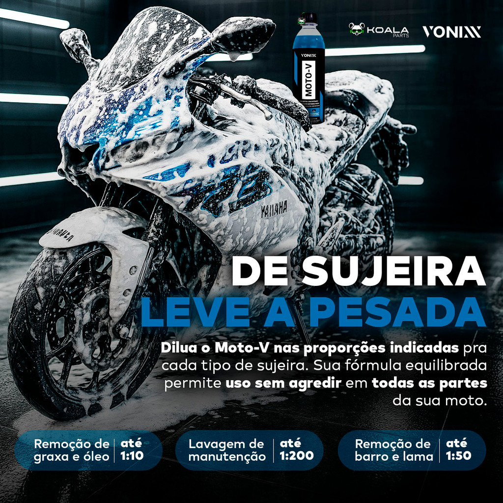 Lava Motos Concentrado Moto-V 1,5L Vonixx Limpeza potente e segura, peça por peça. O Moto-V é um desengraxante concentrado que remove sujeira pesada da sua moto — lama, barro, graxa e óleo — sem agredir pintura, plástico ou metal. - Alta performance contra sujeira pesada - Seguro para motor, pintura, plásticos e metais - Remove barro, lama, graxa e óleo com facilidade - pH alcalino com ação desengraxante poderosa - Diluição versátil: da limpeza leve à pesada, você escolhe Aplicação: - Motor - Pintura - Plásticos - Metais LIMPEZA INTENSA E SEGURA Derruba sujeira pesada sem agredir as superfícies delicadas da sua moto. DILUIÇÃO NA MEDIDA CERTA Personalize o poder de limpeza conforme a necessidade — do dia a dia ao pós-trilha. ALTO RENDIMENTO Fórmula concentrada que rende mais e entrega alta performance em cada uso. Como Usar: 1. Dilua o produto de acordo com a sujeira: Remoção de graxa e óleo - até 1:10 Remoção de barro e lama - até 1:50 Lavagem diária da pintura - até 1:200 2. Realize uma pré-lavagem para remover parte da sujeira superficial. 3. Com um pincel, luva de microfibra ou escova, esfregue a superfície até total desprendimento da sujeira. 4. Enxágue com água em abundancia. * Use EPIs. Enviamos bem embalado, super rápido e com garantia de originalidade. Garanta o seu e confira os outros produtos da nossa Loja Koala Parts. Especificações técnicas: Volume: 1,5L Diluição: 1:10 até 1:200 Estado Físico: Líquido Viscoso Cor do produto: Incolor Tipo: Shampoo Desengraxante Solubilidade em Água: Solúvel pH: 10,0 - 11,0 Conteúdo da embalagem: 1 Lava Motos Concentrado Moto-V 1,5L Vonixx