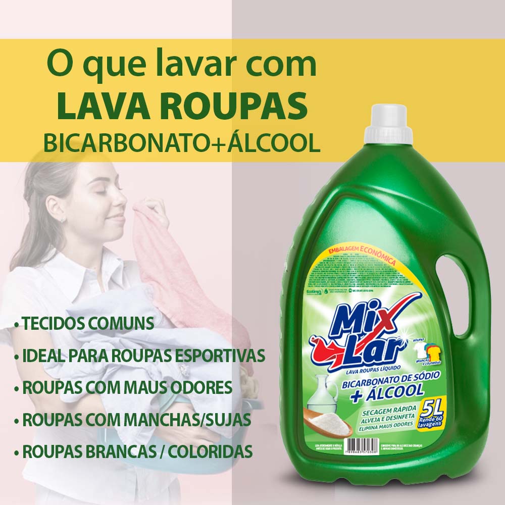 Lava Roupas Líquido Bicarbonato e Álcool Mix Lar O Sabão Líquido Alvejante e Desinfetante Mix Lar é perfeito para cuidar das suas roupas esportivas e do dia a dia! Com sua fórmula inovadora, remove a sujeira, o mau odor e preserva as cores dos tecidos, deixando suas roupas limpas e perfumadas por muito mais tempo. Sua fórmula potente, garante a remoção de 99% das bactérias responsáveis pelo mau odor. Remova mau odor e sujeiras profundas! Ideal para roupas esportivas. O que lavar? - Tecidos comuns - Roupas esportivas - Roupas com maus odores - Roupas com manchas e sujeiras - Roupas brancas e coloridas Modo de usar: dissolva 100ml do lava roupas líquido Mix Lar em 50l de água e em seguida, coloque as roupas de molho por aproximadamente 1 hora. Enxágue e continue com as operações normais de lavagem, não coloque o produto diretamente sobre as roupas. Verificar as instruções de lavagem nas etiquetas das roupas, antes de iniciar as operações de lavagem. Características: - Conteúdo: lava roupas líquido perfumado - Aroma: Tradicional - Quantidade: 5 litros - Composição: princípio ativo, tensoativo aniônico, espessante, alcalinizante, coadjuvantes, álcool, conservante, fragrância, corante e veículo Antes de usar leia as instruções do rótulo. Cuidados ao utilizar: Não ingerir. Evite inalação ou aspiração e contato com os olhos. Evite contato prolongado com a pele. Depois de utilizar este produto, lave e seque as mãos. Manter o produto em sua embalagem original. Não reutilizar a embalagem. Garantia: 7 dias para trocas e devoluções Prazo de validade: 24 meses após data de fabricação