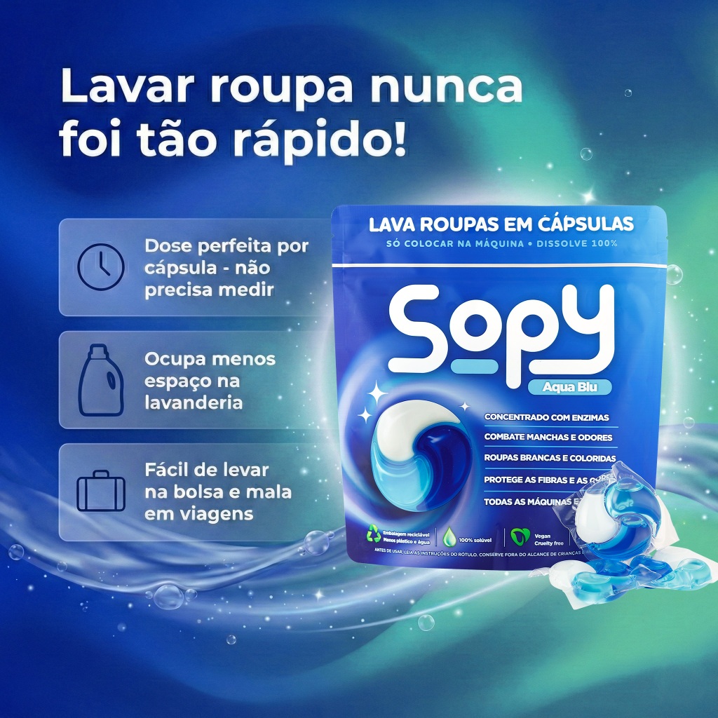 | Lava Roupas em Cápsula Sopy Aqua Blu 225ml (15 unidades) este produto | R$ 44,90 | — | 4.8/5 | — |