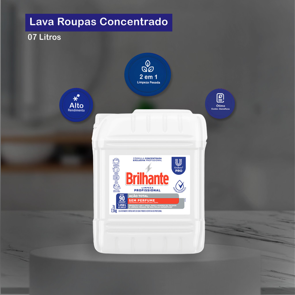 Lava Roupas Líquido Ação Total Sem Perfume 7L Brilhante Detergente versátil, que pode ser utilizado desde a lavagem de roupas até a limpeza de superfícies. Sua fórmula hipoalergênica e sem fragrância o torna ideal para estabelecimentos Food Service, como bares e restaurantes. Produto multiuso pode ser usado na limpeza de uniformes, guardanapos e toalhas de mesa, roupas de cama e toalhas de banho, além de superfícies como pisos e azulejos. Recomendação de Uso: - Lavagem das roupas: Adicione ½ copo americano de 200ml no compartimento indicado para detergente. - Limpeza das superfícies: Antes da sua aplicação remova a sujeira superficial (pó, areia, etc.) com o auxílio de uma vassoura ou pano. - Limpeza diária: Dilua 1 copo americano de 200ml do produto em 30l de água. - Limpezas pesadas: Dilua 3 copos americanos de 200ml do produto em 30l de água. Embalagem: 01 galão de 7L