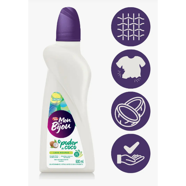 Lava-Roupas Líquido Mon Bijou Coco, embalagem contendo 500 ml, oferece o carinho e cuidado que suas roupas finas e delicadas merecem. Desenvolvido especialmente para lavar tecidos finos, possui óleo de coco natural que ajuda a devolver o branco às roupas e não agride os tecidos. Sua fórmula suave é dermatologicamente testada e poder ser usada em roupas delicadas de crianças e adultos.