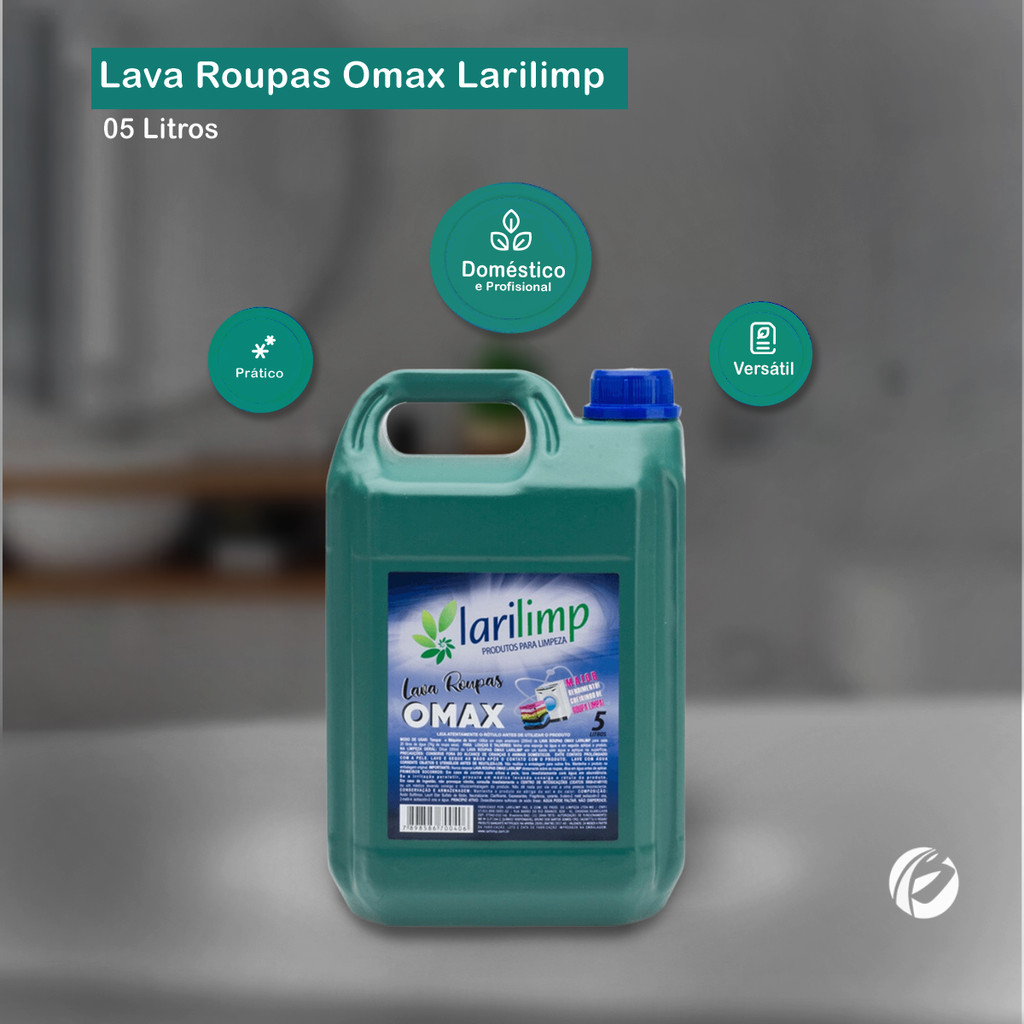 Lava Roupas Líquido Omax 5L Larilimp Sua fórmula contém tensoativos que ajudam a remover manchas e sujeiras, mesmo nas lavagens mais difíceis. Sendo concentrado, o que significa que um pequeno volume é suficiente para proporcionar uma boa limpeza. Sua composição ajuda a preservar os tecidos das roupas, evitando que fiquem danificados com o uso constante de detergentes fortes. Deixa as roupas com um aroma agradável de frescor, sendo um dos pontos destacados do produto. Indicação de Uso: - Lavagem de roupas brancas e coloridas Fragrância: Floral Embalagem: 01 galão de 5L