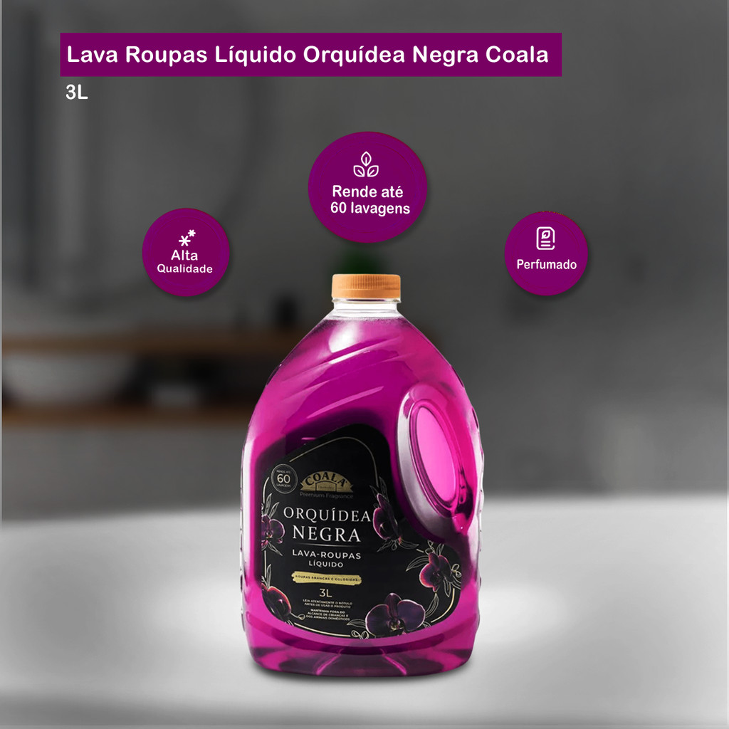 Lava Roupas Líquido Orquídea Negra 3L Coala Limpeza e sofisticação em cada lavagem. O Lava-roupas Líquido Coala Laundry Orquídea Negra possui fórmula exclusiva que remove as sujeiras com precisão enquanto envolve as roupas com a fragrância intensa e marcante da Orquídea Negra. Sua composição conta com tensoativos biodegradáveis e ativos de fontes renováveis, garantindo segurança para você e respeito ao meio ambiente. Indicação de Uso: - Lavagem de roupas brancas e coloridas. Modo de Uso: - Use 50ml de produto para cada 8kg de roupa; - Lave separadamente roupas brancas e coloridas. Para manchas, aplique diretamente no local, deixe agir por alguns minutos e lave normalmente. Fragrância: Orquídea negra Rendimento: Até 60 lavagens Embalagem: 01 frasco de 3L