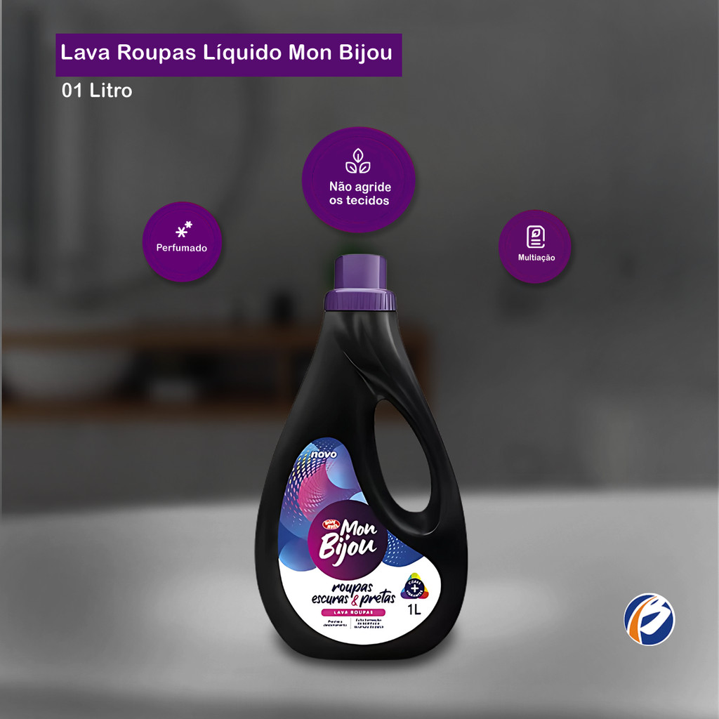 Lava Roupas Líquido para Roupas Escuras e Pretas 1L Mon Bijou Mon Bijou Roupas Escuras e Pretas possui uma fórmula inovadora e exclusiva, que limpa sem danificar os tecidos e evita o desbotamento. Mantém 3X mais vivas as cores dos tecidos, além de reduzir a formação de bolinhas e o acúmulo de pelos nas roupas, para que elas durem muito mais tempo. Indicação de Uso: - Lavagem de roupas escuras e pretas. Modo de Uso: - Lavagem na Máquina: 02 tampas e meia (100ml) - para máquina (8kg / nível médio) de abertura superior, para demais modelos ajustar conforme instrução do fabricante; - Lavagem no Tanque: 01 tampa (40ml) em 5 litros de água fria. Embalagem: 01 frasco de 1L