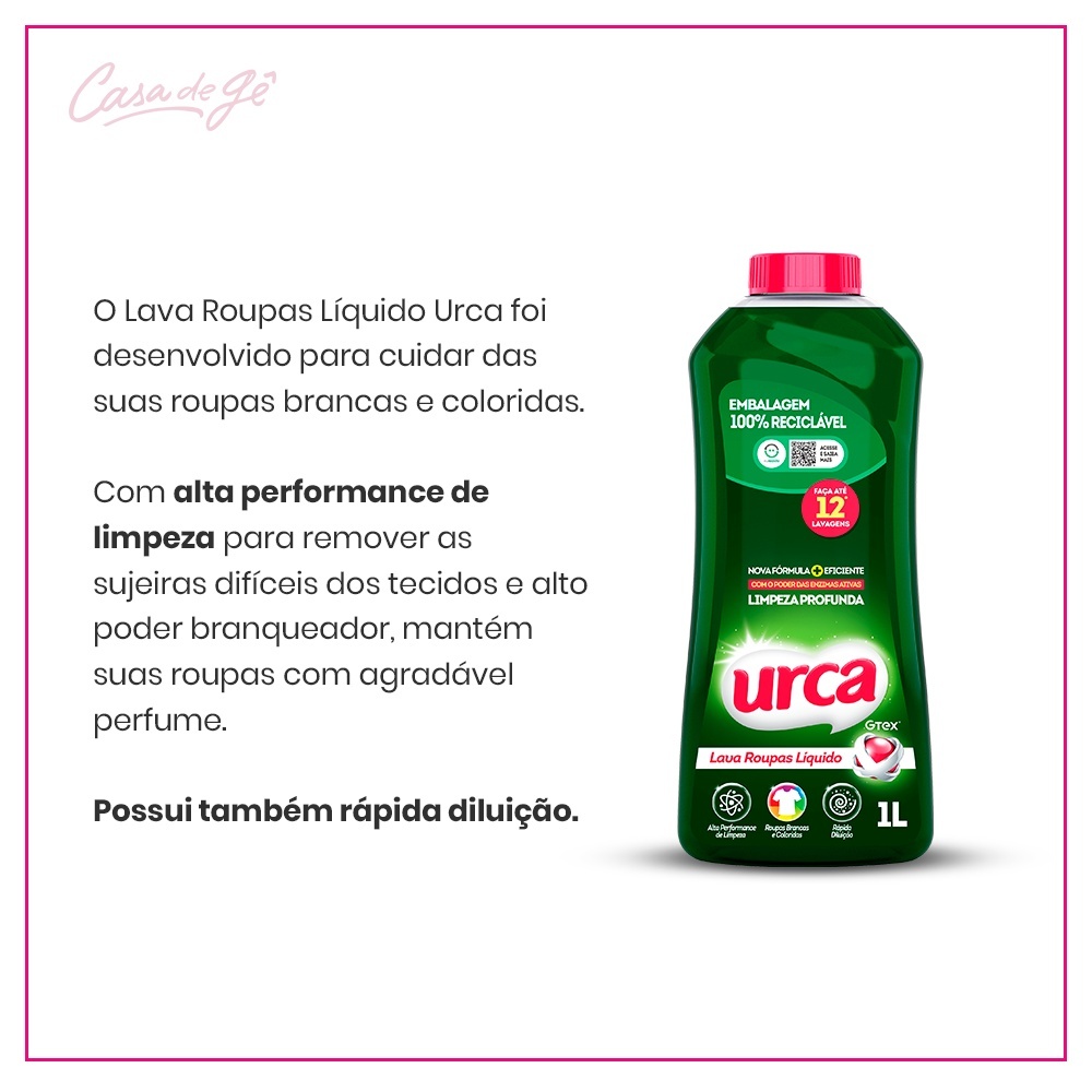 1.Vantagens Cada pessoa tem o seu estilo na hora de lavar roupas e os Lava Roupas Urca estão prontos para atender qualquer tipo de exigência! O Lava Roupas Líquido Urca Maxx Verde tem alta performance sobre a sujeira do dia a dia e possui ação antimanchas. 2.Características do produto (medidas/especificar quando houver variação do mesmo produto) O Lava Roupas Líquido Urca Maxx Verde atua nas manchas mais difíceis, facilitando sua total remoção, tanto em roupas coloridas quanto nas brancas. E falando em roupas brancas, o Lava Roupas Líquido Maxx Urca tem alto poder branqueador, sem falar da fragrância marcante e que deixa sua roupa com aquele cheirinho gostoso de roupa limpa. A versão Verde, com seu perfume marcante de limpeza, é oferecida nas embalagens de 1L (com a variante Nordeste), 3 e 5 litros, com uma formulação eficaz contra manchas e com alto poder branqueador. Pra quem se pergunta se é melhor um lava roupas líquido ou um lava roupas em pó, já posso te dizer que tudo depende do seu gosto. Afinal, o Lava Roupas Urca Maxx tanto em sua versão líquida como em pó, garante a limpeza completa das suas roupas removendo até as manchas mais difíceis e mantendo a cor do tecido. Detalhes técnicos: Unidade: 1L Lava Roupas Líquido Urca Maxx Verde Dimensões da embalagem: 10,8 cm(L)x 7,3 cm(P)x 25 cm(A) Vida útil: 24 meses 3.Composição (do que é feito o produto)/ Especificações técnicas Ativo Hidrótopo Tensoativo Aniônico Alcalinizante Espessante Coadjuvante Fragrância Corantes Conservante Veículo Características do Produto 4. Modo de usar (o da embalagem) Utilize ½ copo tipo americano** do produto e, nas roupas mais sujas, utilize 1 copo americano cheio**, no tanque ou na máquina* cheios com água. Mergulhe as roupas uma a uma e proceda a lavagem habitual. Para a remoção de manchas, sujeiras difíceis ou encardidos, aplique uma quantidade do produto puro diretamente sobre as manchas, ou ainda, em golas e punhos, deixando agir por um período de 30 minutos. Não ultrapasse este período. Essa dosagem é indicada para máquina com capacidade de 5kg, nível médio de água. Para as demais, adequar a dosagem. **Um copo tipo americano equivale a 200 ml. 5. Dica de Gê Nas versões líquidas, pó ou mesmo de coco, os Lava Roupas Urca estão prontos para atender qualquer tipo de exigência. Aqui você pode escolher o seu preferido! E tem mais! Pra potencializar a lavagem das suas roupas, deixá-las macias e com aquele cheirinho maravilhoso, utilize também os Amaciantes Urca.
