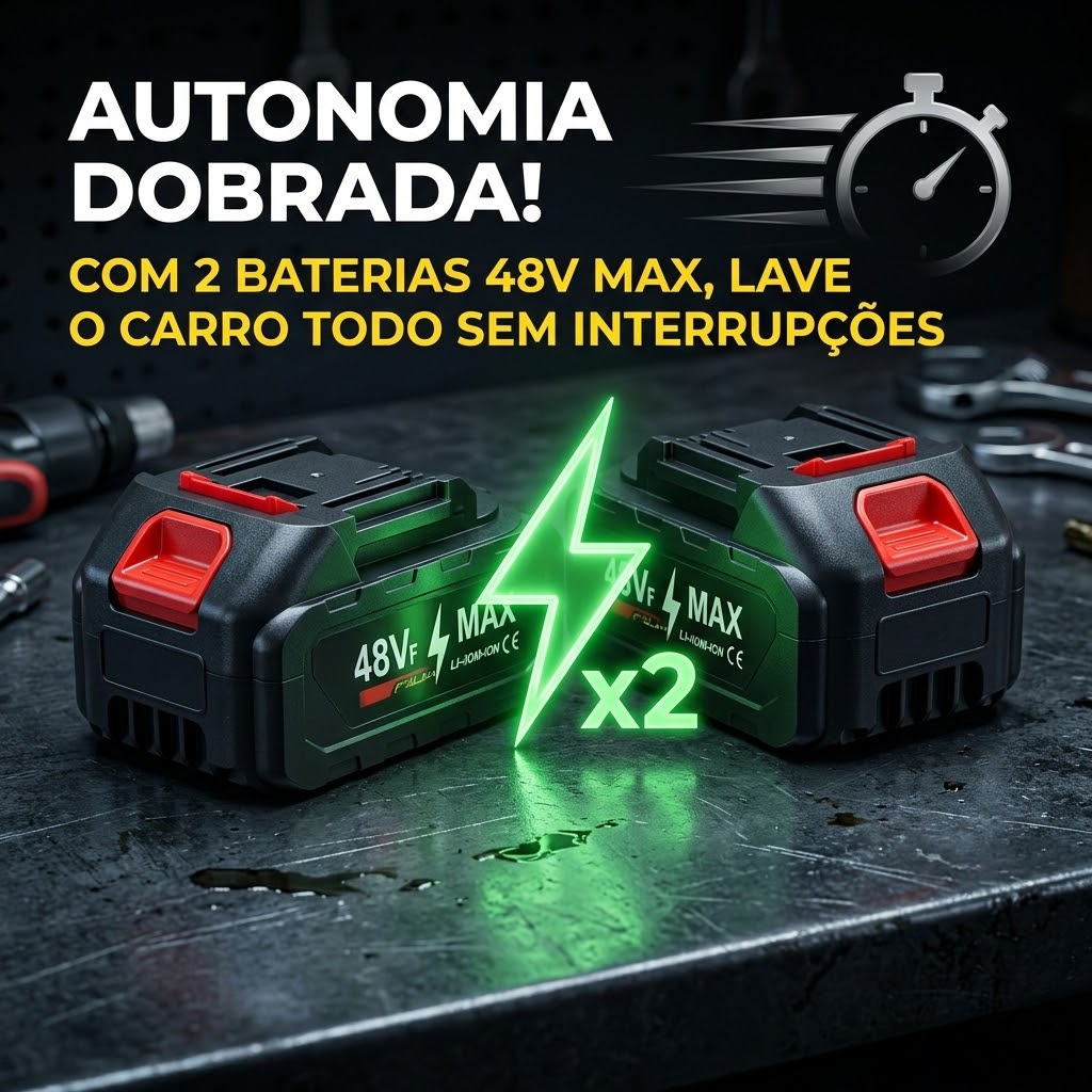 Antes da primeira utilização, recomendamos conectar a lavadora diretamente na torneira para remover o ar do sistema. Carregue as baterias por 12 horas para garantir uma carga completa e o máximo desempenho. Lavadora Jato Portátil de Alta Pressão – Potência e Praticidade para Limpezas Eficazes! Transforme suas tarefas de limpeza em um processo rápido e eficiente com a nossa Lavadora Jato Portátil de Alta Pressão. Seja para lavar o carro, limpar o jardim, áreas externas ou qualquer superfície que precise de uma limpeza profunda, este equipamento é a solução ideal para quem busca praticidade, potência e mobilidade. Especificações Técnicas (base geral de modelos semelhantes) • Tipo: lavadora lava-jato portátil sem fio com bateria. • Alimentação: 2 baterias recarregáveis. • Carregador: bivolt (110V / 220V). • Portabilidade: sem fio, leve e fácil de usar. • Aplicações: carro, moto, bicicleta, quintal, janelas, fachada, etc. O que vem na caixa - 1 Lava Jato Portátil de Alta Pressão - 1 Filtro - 2 Bicos (Alta Pressão) - 1 Bico Extensor - 1 Dispenser de Sabão - 1 Mangueira -1 Fonte de Carregamento - 2 Baterias - 1 Maleta