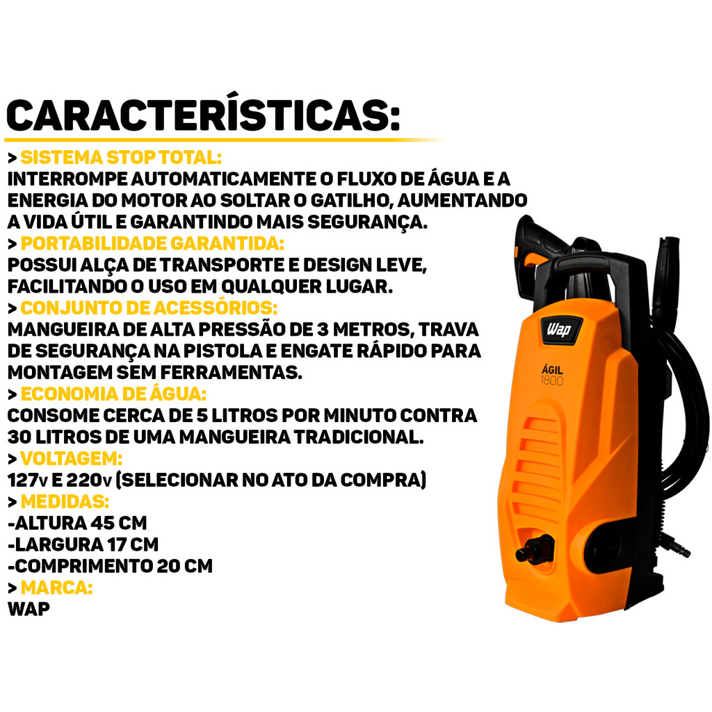 Lavadora de Alta Pressão 1400W 1300PSI WAP Ágil 1800 Se você busca potência, economia e praticidade na limpeza, a Lavadora de Alta Pressão WAP Ágil 1800 é a escolha ideal! Compacta, portátil e eficiente, ela facilita o seu dia a dia na limpeza de calçadas, carros, motos, bicicletas, paredes, quintais e muito mais. Com pressão de até 1300 PSI e vazão de 300 L/h, ela remove sujeiras moderadas com facilidade, economizando até 80% de água em relação à mangueira comum. Perfeita para quem quer desempenho com sustentabilidade. Equipada com motor universal de 1400W, bomba axial com cabeçote em nylon e pistões em aço inox, essa lavadora WAP oferece durabilidade e força em uma estrutura leve e prática. Conta com Sistema Stop Total, que desliga o motor e corta a água ao soltar o gatilho, poupando energia e aumentando a vida útil do equipamento. Possui ainda engate rápido, trava de segurança na pistola, alça de transporte, cabo elétrico de 5 metros e mangueira de alta pressão com 3 metros — tudo para tornar sua limpeza mais segura, ágil e sem esforço. Características: > Economize até 80% de água comparado à mangueira comum; > Compacta, leve e fácil de transportar – ideal para uso doméstico; > Pressão de 1300 PSI para remover sujeiras com eficiência; > Bico regulável – escolha entre jato concentrado ou leque; > Motor potente e durável com 1400W e pistões em aço inox; > Sistema Stop Total – mais segurança e economia de energia; > Engate rápido – conexão simples e sem ferramentas; > Alto desempenho em áreas externas, carros, bikes e mais; > Acompanha todos os acessórios essenciais para uso imediato. Especificações: > Potência: 1400W; > Motor: Universal; > Pressão Máxima: 1300 PSI; > Vazão: 300 litros/hora; > Corrente Elétrica: 10 A; > Frequência: 60 Hz; > Classe de Isolação: II; > Mangueira de Alta Pressão: 3 metros (nylon); > Comprimento do Cabo Elétrico: 5 metros; > Tipo de Plugue: 2 pinos; > Dimensões (CxLxA) ( 20cm x 17cm x 45cm ); > Acessórios Inclusos: -1 Pistola com trava de segurança; -1 Lança com bico regulável (leque e concentrado); -1 Mangueira de alta pressão 3 m; -1 Engate rápido; -1 Agulha de limpeza de bico. - Marca: WAP - Garantia: 12 meses contra defeitos de fabricação Vantagens de comprar na Brester: - Produto a pronta entrega. - Produto novo, com garantia de fábrica. - Nota fiscal para Pessoa Física e Pessoa Jurídica.
