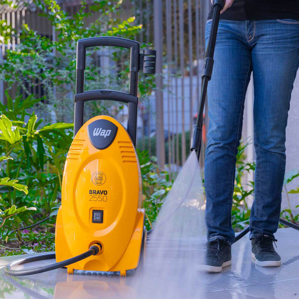 Lavadora Alta Pressão 1700W 1800Psi Profissional Wap Quando estão reunidas performance e turbo na limpeza A lavadora de alta pressão WAP Bravo 2550 é a melhor opção para limpar sujeiras pesadas e profundas com rapidez e agilidade, economizando tempo e até 80% de água se comparada à mangueira comum. Com motor de indução, bico turbo, potência de 1700W e pressão máxima de 1800 PSI é o equipamento perfeito para a remoção de níveis incrustados de sujeira nos mais diversos tipos de pisos e superfícies. Equipada com alça e rodas que facilitam o transporte, a WAP Bravo 2550 conta com cabo elétrico de 5 metros, mangueira de alta pressão de 5 metros, trava de segurança da pistola, bico regulável (concentrado ou leque), aplicador de detergente e o sistema stop total, que corta o fluxo de água e a energia do motor ao soltar o gatilho, poupando energia e aumentando a vida útil do motor. A lavadora de alta pressão conta também com motor de indução e pistões em aço inox que conferem mais durabilidade para o produto. Para deixar o produto mais completo, a máquina vem equipada também com o bico turbo que possibilita a limpeza de sujeiras pesadas de forma mais prática e rápida. A lavadora de alta pressão WAP Bravo 2550 vem com um porta-acessórios que acomoda pistola, baioneta e lança. E, para o trabalho ficar ainda mais fácil e dinâmico, ela vem equipada com o engate rápido, para você montar e desmontar a mangueira em um clique, sem a necessidade de usar ferramentas. Se você procura agilidade e praticidade para o seu dia a dia, não perca mais tempo e garanta já a sua lavadora de alta pressão WAP Bravo 2550. Wap tem que ser da WAP! - Bomba Axial com Cabeçote de Alumínio - Pistões em aço Inox - Sistema Stop Total - Indicado pra Paredes, Motos, Lavanderia, Cozinha, Carros, Calçadas, Bicicletas, Banheiros, Jardim, ou onde se fizer necessário o uso da lavadora. Acessórios Incluso: - 1 Pistola de alta pressão com trava de segurança. - 1 Baioneta com conexão rápida. - 1 Lança com bico regulável (leque e concentrado). - 1 Bico turbo. - 1 Aplicador de detergente. - 1 Mangueira de alta pressão de 5 metros. - 1 Engate rápido. - 1 Agulha de limpeza do bico. Referencia: 3369 / 2960 - Código: 31050011 / 31050022 - Tensão: 127v ou 220v (Escolher, conforme disponibilidade). - Modelo: WAP BRAVO 2550 - Indicado: Profissional Semi Intensivo - Cor: Amarelo com Preto - Potência Elétrica: 1700W - Pressão Máxima: 1800Psi - Motor: Indução - Vazão: 360 L/h - Classe de Isolação: I - Frequência: 60Hz - Cabo Elétrico: 5 Metros - Mangueira: 5 Metros - Garantia: 1 Ano Dimensões Aproximadas: - Altura: 80cm - Largura: 30,5cm - Comprimento: 25cm - Peso Líquido: 11 Kg - Peso Bruto: 15 Kg - Dimensões da Caixa (CxLxA): 84 x 37 x 31,5 cm
