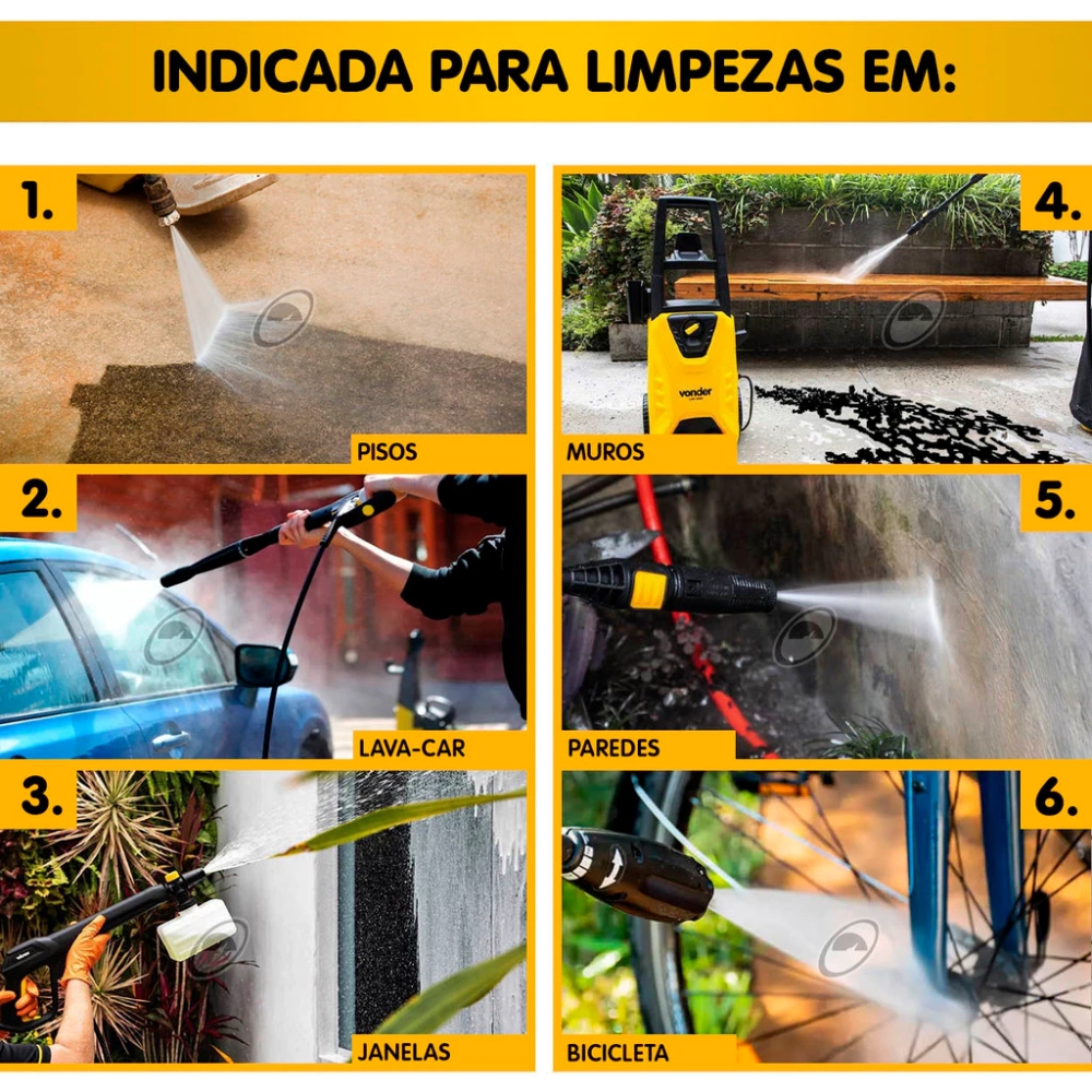 Lavadora de alta pressão LAV 2000, 2.100 lbf/pol, 220 V~, VONDER Conta com sistema que gera mais pressão e libera menos água, tornando-a mais eficiente e diminuindo desperdícios. Em média, uma torneira aberta consome 1.800 litros de água por hora. Com o uso da Lavadora de Alta Pressão LAV 2000 esse consumo cai para 330 litros por hora, promovendo grande economia de água. Possui alça e rodas para transporte, suportes para armazenar a pistola e o cabo elétrico. Bico turbo, que aumenta a pressão da água e potencializa a limpeza, bico da lança ajustável com jato leque ou concentrado e acompanha ainda acessório para detergente. Conta também com sistema stop total que proporciona maior praticidade e economia de água e energia, desligando o motor toda vez que o gatilho é liberado. Uso doméstico. Indicada para limpezas em geral, com maior remoção de sujeira, devido a alta pressão de saída da água. Ideal para os mais diversos usos, como na limpeza de pisos, carros, motos, bicicletas, muros e muito mais! Basta regular a saída de água no bico, alternando entre jato leque e concentrado para obter a máxima eficiência na limpeza. Linha: Leve Modelo: LAV 2000 Pressão máxima de saída de água da lavadora de alta pressão: 2.100 lbf/pol² - 145 bar - 14,5 MPa Pressão nominal de saída de água: 1.450 lbf/pol² - 100 bar - 10,0 Mpa Potência: 1.800 W Potência: 2,4 cv/hp Vazão máxima da lavadora de alta pressão: 450 litros/hora - 7,5 litros/min Vazão nominal: 330 litros/hora - 5,5 litros/min Nível de ruído: 76 dB(A) Segue norma: IEC 60335-1 e IEC 60335-2-79 Dispositivo para aplicação de detergente da lavadora de alta pressão: Reservatório externo Tipo de motor da lavadora de alta pressão: Universal Material dos pistões da bomba: Aço Inox Tensão (V): 220 V~ Frequência: 60 Hz Cor: Amarela e preta Comprimento do cordão elétrico: 5 m Massa aproximada (peso) (kg): 8,4 kg Conteúdo da Embalagem: 1 Lavadora de alta pressão. Acompanha: 1 acessório para detergente, 1 mangueira de alta pressão com 5 m, 1 lança com bico leque ajustável, 1 bico turbo, 1 pistola com gatilho e 1 conector engate rápido de 1/2" com filtro interno lavável.
