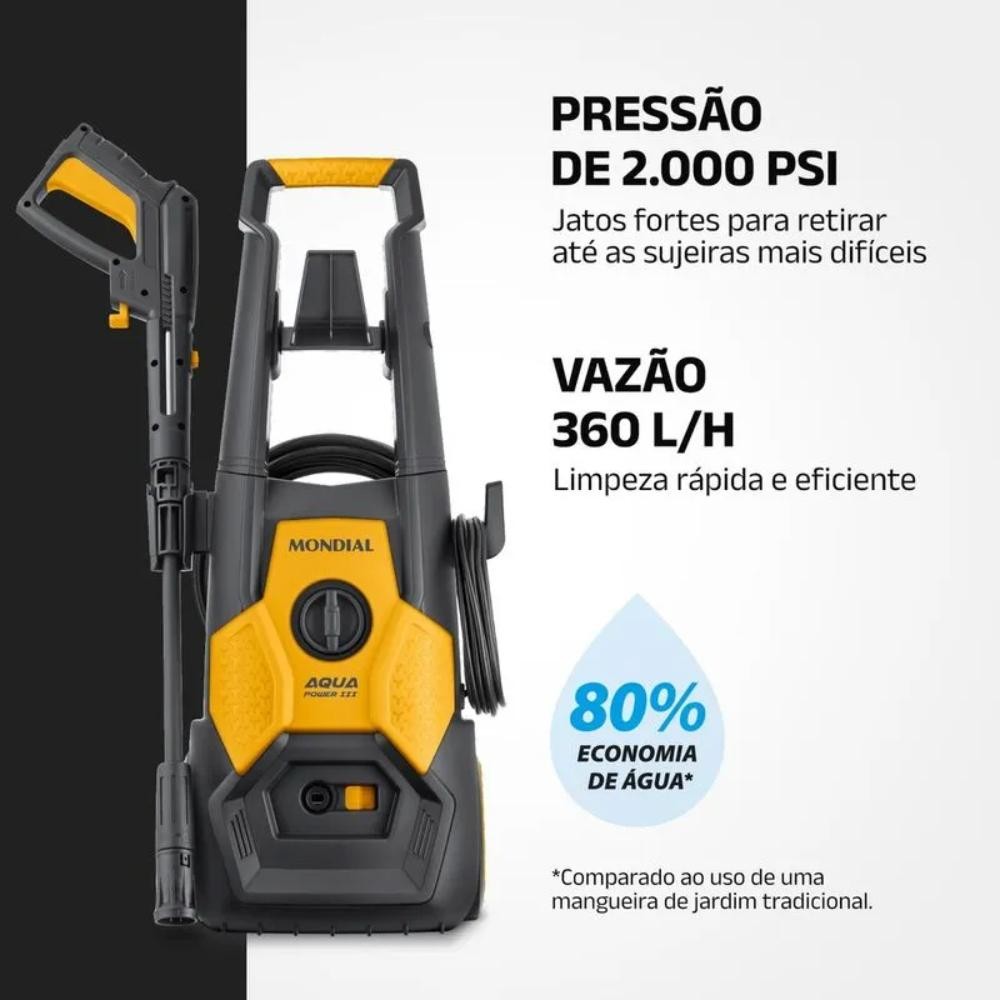 A Lavadora de Alta Pressão Aqua Power III da Mondial é ideal para uma limpeza eficiente e versátil. Com alta potência de 1.800W, pressão de 2.000 PSI e vazão de 360 L/h, ela permite uma limpeza profunda e rápida em pisos, veículos, bicicletas, quintais e muito mais. A Aqua Power III também é altamente prática: com rodas e alça para transporte, você pode transportá-la facilmente e alcançar qualquer área com conforto. Além disso, a lavadora de alta pressão economiza até 80% de água em comparação com uma mangueira comum, tornando-se uma escolha sustentável e econômica. CARACTERÍSTICAS: Potência de 1.800W: Com motor eficiente e resistente, a lavadora de alta pressão Aqua Power III é ideal para realizar diversas tarefas de limpeza com facilidade e alto desempenho. Pressão de 2.000 PSI: Livre-se das sujeiras! Os jatos fortes da LAP-03-GY são ótimos para limpezas mais complexas. Vazão Máxima 360 L/H: Limpa qualquer área de forma potente com economia de água e tempo. Economia de Água: A lavadora de alta pressão otimiza o consumo de água proporcionando até 80% de economia durante o uso. Comparado ao uso de uma mangueira de jardim tradicional. Engate Rápido: Conecta a mangueira de forma prática e fácil, evitando vazamentos de água. Rodas e Alça para Transporte: Permite movimentar a lavadora de um lugar para outro facilmente. Ideal para limpar áreas grandes ou para quando há necessidade de limpar diferentes locais. Maior Alcance e Autonomia: A lavadora da Mondial possui cabo elétrico de 5 metros e uma mangueira com 5 metros, permitindo uma limpeza super completa e sem interrupções para troca de tomada. Aplicador de Detergente Integrado: Aplique o detergente diretamente e de maneira uniforme nas superfícies, potencializando a ação do jato de alta pressão para uma limpeza mais rápida e eficiente. Armazenamento Prático: Organize tudo com facilidade! Com suporte para cabo elétrico, mangueira, pistola e porta-acessórios, você mantém todos os itens em um só lugar, facilitando o armazenamento do produto em espaços reduzidos. Limpeza Fácil e para Todas as Ocasiões: A Aqua Power III é indicada para limpeza de pisos, bicicletas, motos, carros, jardins, calçadas, paredes e quintais. Acessórios Indispensáveis: Acompanha lança com bico regulável, engate rápido com adaptador, agulha desobstruidora, pistola de alta pressão e mangueira de alta pressão. DIMENSÕES E INFORMAÇÕES TÉCNICAS: Altura: 78,1 cm Largura: 35,3 cm Profundidade: 29 cm Peso: 7,4 kg Potência: 1.800 Watts Tensão / Voltagem: 127V Cor (es): Cinza e Amarela CONTEÚDO DA EMBALAGEM: 01 Lavadora de Alta Pressão 01 Mangueira de Alta Pressão 01 Pistola de Alta Pressão 01 Lança com Bico Regulável 01 Engate Rápido com Adaptador 01 Agulha Desobstruidora 01 Manual de Instruções