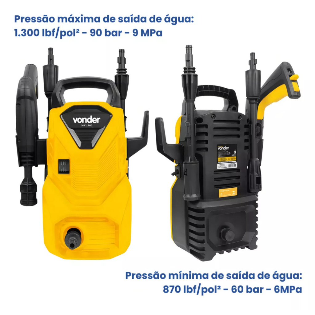 Lavadora de Alta Pressão LAV1300 Vonder Conta com sistema que gera mais pressão e libera menos água, tornando-a mais eficiente e diminuindo desperdícios. Em média, uma torneira aberta consome 1.800 litros de água por hora. Com o uso da Lavadora de Alta Pressão LAV 1300 esse consumo cai para 300 litros por hora, promovendo grande economia de água. Possui tamanho reduzido que facilita seu armazenamento, alça, suporte para armazenar a pistola e o cabo elétrico, promovendo maior organização. Bico da lança ajustável, com jato leque ou concentrado e acompanha ainda acessório para detergente. Conta também com sistema stop total que proporciona maior praticidade. Uso doméstico. Indicada para limpezas em geral, com maior remoção de sujeira, devido a alta pressão de saída da água. Ficha técnica: - Modelo: LAV 1300 - Potência:1,30 cv/hp - Potência:1.200 W - Pressão máxima de saída de água da lavadora de alta pressão: 1.300 lbf/pol² - 90 bar - 9 MPa - Pressão nominal de saída de água :870 lbf/pol² - 60 bar - 6MPa - Vazão nominal :330 litros/hora - 5litros/min - Vazão máxima da lavadora de alta pressão: 390 litros/hora - 6,5 litros/min - Nível de ruído: 75 dB dB(A) - Segue norma: ABNT NBR IEC 60335-1 e IEC 60335-2-79 - Dispositivo para aplicação de detergente da lavadora de alta pressão :Reservatório externo - Material dos pistões da bomba: Aço inox - Frequência:60 Hz - Linha: Leve - Recomendações de segurança: Não utilize a máquina se o cordão de alimentação elétrica ou partes de segurança estiverem danificadas. - Tipo de motor da lavadora de alta pressão:Universal Itens inclusos: - 1 Lavadora de alta pressão. - 1 Acessório para detergente. - 1 Mangueira Garantia de Fabrica: 12 meses
