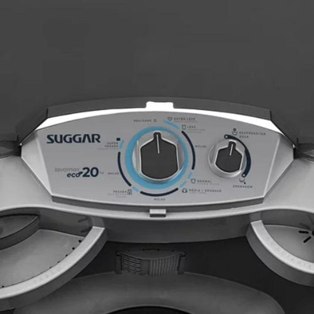 Lavadora De Roupas Suggar Eco 20kg Prata 110v Le2001pr<br>A Lavadora de Roupas Suggar Eco 20Kg Prata 110V LE2001PR semiautomática chegou para agilizar a seu dia a dia! Com capacidade para lavar até 20kg de roupas, incluindo edredom de casal tamanho King, e sistema de drenagem, é a maior máquina de lavar roupas da categoria. Além disso, ela possui função reaproveitar água, 1 dispenser para sabão e outro para amaciante, 3 níveis de água e filtro cata-fiapos, 3 molhos, desligamento automático, timer com programação e 6 programas de lavagem. Tudo isso com um baixo consumo de energia.