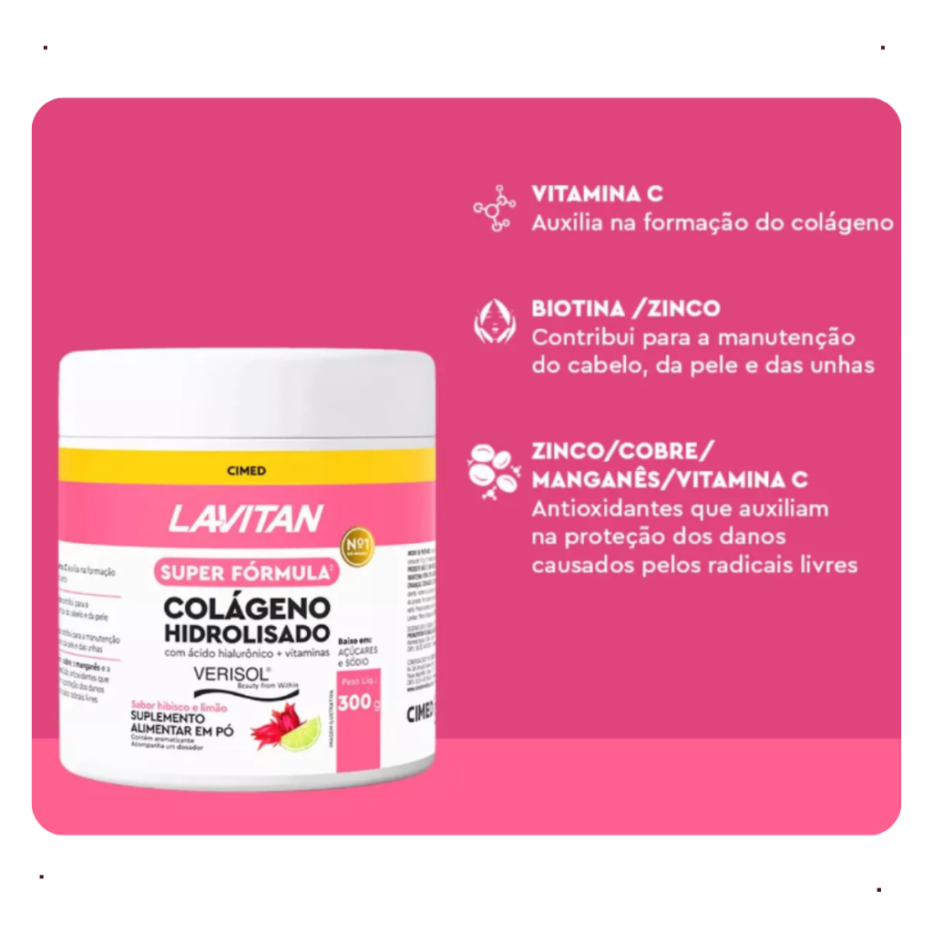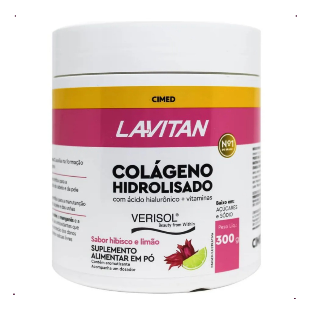 O Lavitan Colageno Hidrolisado com Acido Hialurônico e Verisol é um suplemento alimentar de alta qualidade da marca Cimed. Este produto, com sabor de hibisco e limão, é ideal para a manutenção da pele, cabelo e unhas, graças à sua composição rica em biotina e zinco. Além disso, contém vitamina C, que auxilia na formação de colágeno, e antioxidantes como zinco, cobre, manganês e vitamina C, que protegem contra os danos causados pelos radicais livres. Este suplemento vem em um pote de 300g, com uma porção recomendada de 0.3g, o que proporciona aproximadamente 1000 porções por embalagem. Cada porção de 0.3ml contém 0.9 aminoácidos. É importante notar que este produto contém lactose, mas é livre de glúten. No entanto, não é adequado para veganos.