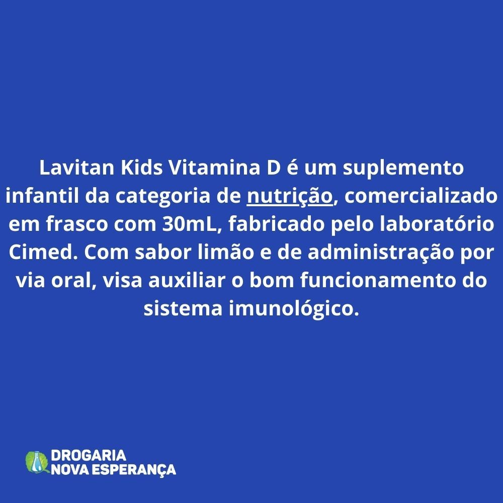 Lavitan Kids Vitamina D é um suplemento infantil com sabor limão, indicado para reforçar a nutrição da criança.