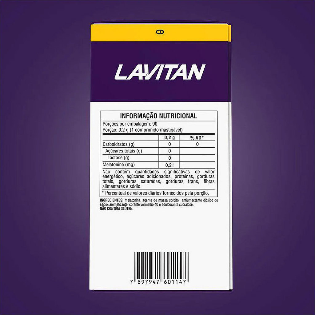 Lavitam Melatonina Sabor Morango com 90 comprimidos Lavitan Melatonina é um suplemento alimentar com 0,20mg de melatonina. Comprimidos mastigáveis com rápida absorção. - Rápida Absorção; - Recomendado uso noturno; Modo de usar Ingerir 1 comprimido ao dia, 30 minutos antes de dormir.