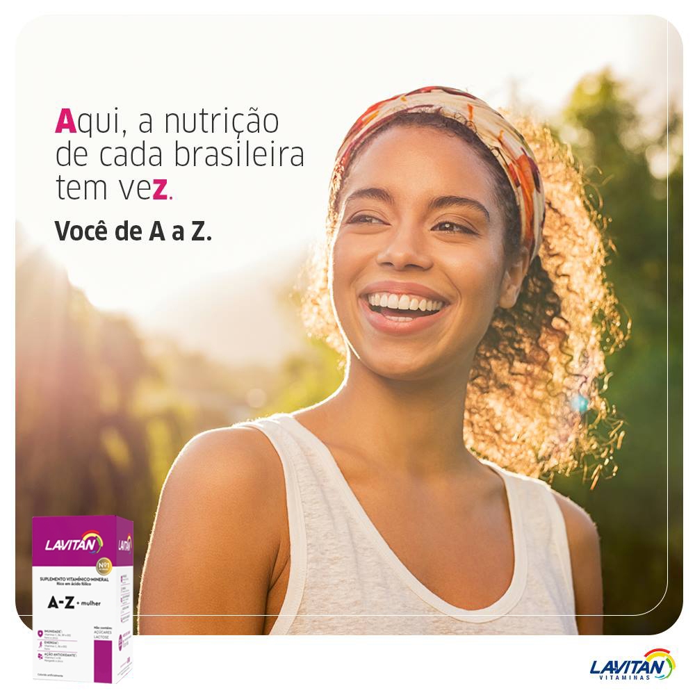 LAVITAN A-Z MULHER COM 90 COMPRIMIDOS Lavitan Mais Mulher é um suplemento vitamínico-mineral em comprimidos com fórmula mais completa de A-Z, especialmente desenvolvida para a mulher. Rico em ácido fólico. Zero calorias. Uso oral. Uso adulto. Sugestão de uso: Ingerir 1 (um) comprimido por dia. Composição: Ácido ascórbico, sulfato ferroso, nicotinamida, sulfato de zinco, sulfato de manganês, d-pantotenato de cálcio, acetato de vitamina A, cloridrato de tiamina, riboflavina, cloridrato de piridoxina, ácido fólico, vitamina D3, cianocobalamina, antiumectante dióxido de silício, estabilizantes celulose microcristalina e croscarmelose sódica, revestimento (agente de corpo etilcelulose, estabilizante hidroxipropilmetilcelulose, umectante triacetina, corante inorgânico dióxido de titânio e corantes vermelho 40, vermelho eritrosina e carmim). SEM ADIÇÃO DE AÇÚCARES. NÃO CONTÉM GLÚTEN. Contraindicações: Hipersensibilidade (alergia) aos componentes da formulação. Precauções: Gestantes, nutrizes e crianças de até 3 (três) anos de idade, somente devem consumir este produto sob orientação de médico ou nutricionista. Consumir este produto conforme a recomendação de ingestão diária constante na embalagem. Mantenha o produto fora do alcance das crianças. Registro no Ministério da Saúde: isento conforme RDC 27/10