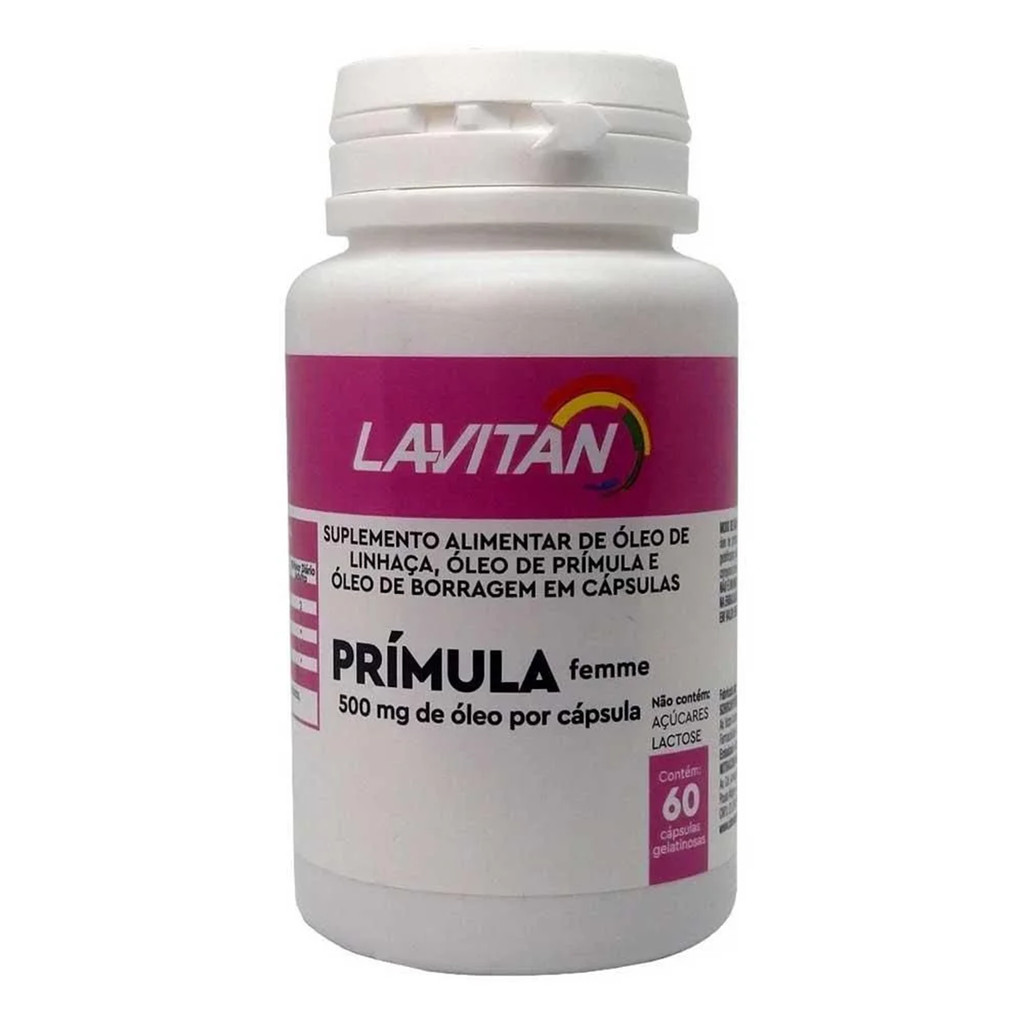 Lavitan Primula Femme 60 Cápsulas O Lavitan Prímula Femme é um suplemento alimentar em cápsulas, desenvolvido com uma fórmula exclusiva à base de óleo de prímula, óleo de semente de borragem e óleo de linhaça. Esses ingredientes naturais são conhecidos por seus benefícios para a saúde feminina, especialmente no equilíbrio hormonal e no bem-estar geral. Benefícios: Auxilia no equilíbrio hormonal, especialmente durante o ciclo menstrual e menopausa; Óleo de Semente de Borragem (Rico em ácido gama-linolênico), promove saúde da pele e combate inflamações; Fonte de ômega 3, ajuda na saúde cardiovascular e no equilíbrio hormonal. Suplemento ideal para mulheres que buscam melhorar o bem-estar físico e emocional. Fórmula rica em ácidos graxos essenciais, promovendo saúde da pele, equilíbrio hormonal e alívio de sintomas menstruais. Prático e fácil de incluir na rotina diária com 60 cápsulas. Garanta mais saúde e bem-estar com Lavitan Prímula Femme e aproveite os benefícios naturais dos óleos de prímula, borragem e linhaça!