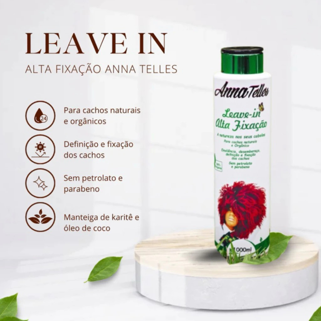O Leave-in Alta Fixação Anna Telles foi desenvolvido especialmente para cabelos cacheados, crespos e orgânicos, proporcionando hidratação profunda, definição duradoura e proteção contra agentes externos. Sua fórmula combina Manteiga de Karité e Óleo de Coco, garantindo nutrição intensa e brilho radiante, sem pesar os fios. Benefícios: - Hidratação e nutrição profunda, promovendo fios mais saudáveis. - Redução de frizz e controle da umidade por até 24 horas. - Ação anti-quebra, fortalecendo a fibra capilar e reduzindo pontas duplas. - Facilidade no desembaraço e modelagem dos cachos. - Brilho intenso com efeito gloss, vinil e verniz. Modo de uso: Com os cabelos limpos e úmidos, espalhe o produto nas mãos e aplique nos fios, amassando das pontas até a raiz. Para melhores resultados, enluve mecha a mecha. O efeito máximo é perceptível após três dias de uso contínuo. Realce a beleza natural dos seus cachos com o Leave-in Alta Fixação Anna Telles!