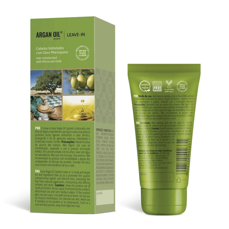LEAVE-IN INOAR ARGAN OIL SYSTEM 50G =================================== O Leave-in Inoar Argan Oil System é ideal para dar proteção e maleabilidade aos cabelos, nutrindo profundamente com Óleo de Argan. Deixa os fios saudáveis e brilhantes. A fórmula atua como um escudo protetor, defendendo os cabelos de poluição, calor e raios UV. Desfrute de fios mais macios e nutridos ao longo do dia com um toque sedoso e leveza incomparável. PROTEÇÃO CONTRA AGRESSÕES EXTERNAS A fórmula atua como um escudo protetor, defendendo os cabelos de poluição, calor e raios UV. HIDRATAÇÃO PROLONGADA PARA CABELOS SEDOSOS Desfrute de fios mais macios e nutridos ao longo do dia com um toque sedoso e leveza incomparável. MODO DE USO =========== Aplique nos cabelos úmidos ou secos, sem enxágue, para manter os fios hidratados e protegidos. Coloque uma pequena quantidade na palma da mão e espalhe uniformemente. Distribua o produto da raiz às pontas, garantindo que todos os fios recebam o produto. Utilize um pente ou escova para ajudar a distribuir melhor o leave-in nos cabelos. Deixe secar naturalmente ou utilize secador para estilizar conforme desejado. APLICAÇÃO Coloque uma pequena quantidade na palma da mão e espalhe uniformemente. DISTRIBUIÇÃO Distribua o produto da raiz às pontas, garantindo que todos os fios recebam o produto. USO DE ESCOVA Utilize um pente ou escova para ajudar a distribuir melhor o leave-in nos cabelos. SECAGEM Deixe secar naturalmente ou utilize secador para estilizar conforme desejado. CARACTERÍSTICAS E BENEFÍCIOS DO LEAVE-IN INOAR ARGAN OIL SYSTEM =============================================================== O Leave-in Inoar Argan Oil System é adequado para todos os tipos de cabelo, conferindo leveza e suavidade. Desenvolvida para não sobrecarregar os cabelos, permitindo suavidade e movimento natural. Age como um escudo protetor contra poluentes ambientais comuns no dia a dia. Garante que a hidratação penetre profundamente nos fios, mantendo-os nutridos por mais tempo. Pode ser usado em diversos tipos de cabelo, adaptando-se bem às suas necessidades individuais. FÓRMULA LEVE Desenvolvida para não sobrecarregar os cabelos, permitindo suavidade e movimento natural. PROTEÇÃO CONTRA DANOS Age como um escudo protetor contra poluentes ambientais comuns no dia a dia. AÇÃO HIDRATANTE PROLONGADA Garante que a hidratação penetre profundamente nos fios, mantendo-os nutridos por mais tempo. IDEAL PARA TODOS OS TIPOS DE CABELO Pode ser usado em diversos tipos de cabelo, adaptando-se bem às suas necessidades individuais. ESPECIFICAÇÕES TÉCNICAS ======================= Embalagem prática de 50g, perfeita para levar na bolsa ou em viagens. Tipo de Produto: Leave-in Composição Principal: ÓLeo de Argan Certificações: Vegano e Cruelty-free Textura: Fórmula leve Uso Indicado: Todos os tipos de cabelo Embalagem: 50g tubo plástico reciclável SOBRE A MARCA INOAR =================== A Inoar é reconhecida por sua dedicação à qualidade e inovação em produtos de beleza. Prioriza a hidratação e nutrição dos cabelos, destacando-se pela eficácia e resultados visíveis. Os produtos são desenvolvidos com ingredientes selecionados que garantem resultados eficazes. As embalagens são recicláveis e a marca é cruelty-free. A Inoar oferece uma extensa linha de produtos para atender diferentes tipos de cabelo e necessidades. QUALIDADE COMPROVADA Os produtos são desenvolvidos com ingredientes selecionados que garantem resultados eficazes. COMPROMISSO COM A SUSTENTABILIDADE As embalagens são recicláveis e a marca é cruelty-free. VARIEDADE DE PRODUTOS A Inoar oferece uma extensa linha de produtos para atender diferentes tipos de cabelo e necessidades.