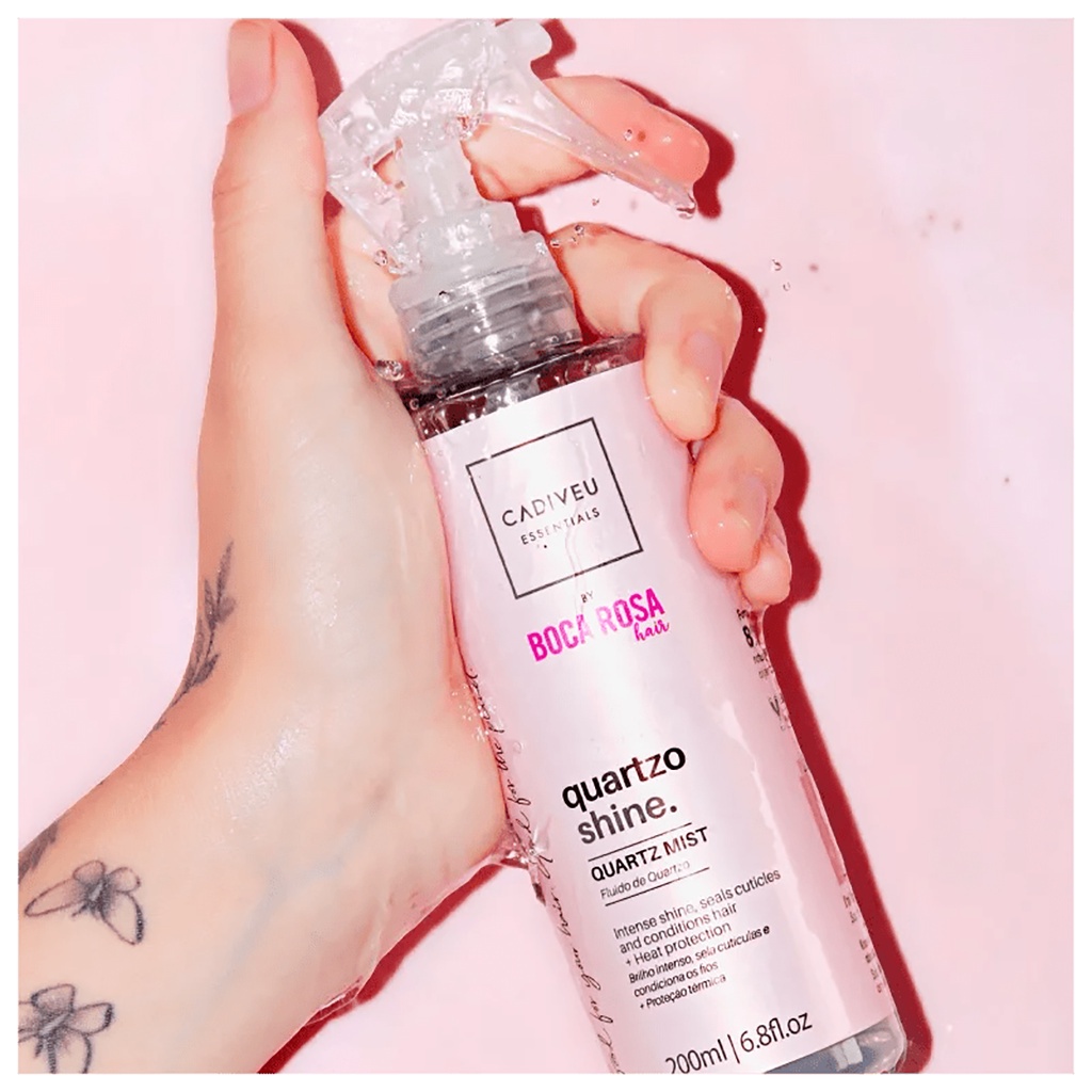 Leave- in Protetor Térmico Quartzo Shine by Boca Rosa Hair 200ml Leave-in para cabelos secos e opacos. O Cadiveu Essentials Quartzo Shine By Boca Rosa Hair protege os fios contra danos térmicos sem acumular resíduos, garantindo um toque aveludado e cabelos brilhantes. Finalizador de uso diário para facilitar o processo da escovação ou prolongar a sensação de cabelos leves o dia todo. O Leave-in Cadiveu Essentials Quartzo Shine By Boca Rosa Hair é a nova versão do antigo Leave-in Boca Rosa Hair e o que já era bom ficou ainda melhor. Enriquecido com partículas de quartzo rosa, dá equilíbrio da raiz às pontas, proporcionando leveza e brilho tridimensional. O resultado é um cabelo poderoso, nutrido e cheio de brilho. O produto é um ótimo aliado para facilitar o processo de escovação, promovendo um toque sedoso aos fios e protegendo a cor dos cabelos. Sua fórmula é ultraleve, alinhando enquanto doa brilho excepcional, eliminando o efeito ressecado dos fios. Possui ativos que atuam diretamente na prevenção do frizz e proteção dos fios. Ação: Quartzo Rosa e proteína vegetal: a união desses dois ingredientes promove aquela mudança que o seu cabelo seco e opaco precisa! O resultado é muita nutrição e brilho para os seus cabelos. Extrato de aveia: se o seu cabelo precisa se salvação, esse ativo rico em aminoácidos, proporciona além de restauração, proteção, maciez e maleabilidade dos fios. Modo de uso: Aplique o Fluído Quartzo Shine nos cabelos molhados ou secos, com uma distância média de 20cm e penteie. Dica: Use o Quartzo Líquido para fechar com chave de ouro após finalizar!