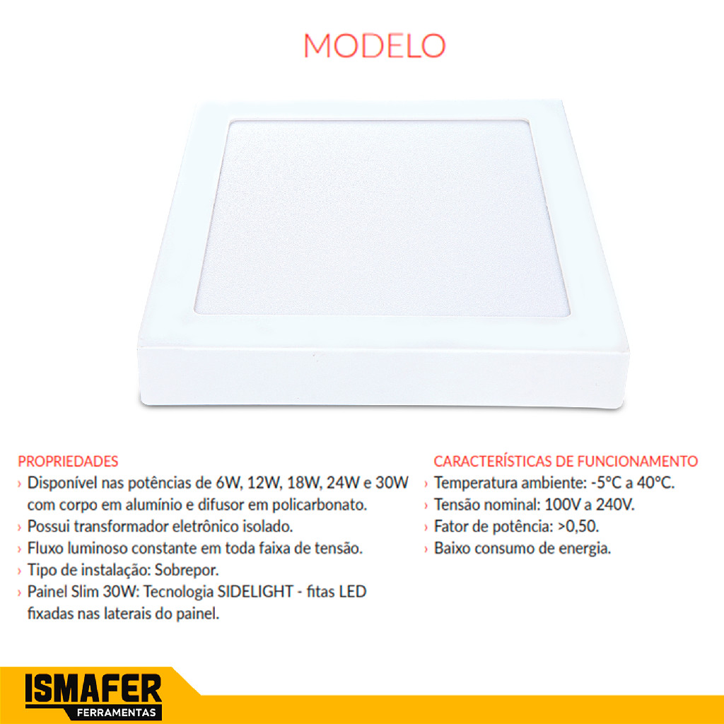 Distribuído por Ismafer Ferramentas Painel LED Quadrado Sobrepor 6500K 24W 290 x 290 x 40 (mm)Ilumine seu espaço com o moderno Painel Led Quadrado Sobrepor 24W. Com temperatura de cor de 6500K, este painel oferece uma luz de cor branco frio, ideal para ambientes que requerem uma iluminação brilhante e clara.Sua potência de 24W garante uma luminosidade eficiente, proporcionando uma atmosfera luminosa e agradável.Com tecnologia LED de última geração, é altamente econômico, consumindo menos energia em comparação às tradicionais lâmpadas incandescentes ou fluorescentes.Ideal para escritórios, cozinhas, banheiros, corredores e outros espaços internos. Esse painel oferece uma iluminação homogênea e de qualidade superior, contribuindo para um ambiente mais produtivo e aconchegante. FICHA TÉCNICA: - Tamanho do produto: 290 x 290 x 40 (mm)- Temperatura de cor: Branco frio (6500K)- Economia de energia em até 80%- Fluxo Luminoso : 1680 Lumens- Vida útil estimada em 25.000h- Eficiência Luminosa: 70 lm/W- Voltagem: 110-220V (Bivolt)- Tipo de instalação : Sobrepor- Ângulo de abertura: 120°- Fator de potência: >0,50- Frequência: 50/60 Hz- Não Dimerizável- Proteção: IP20- Potência: 18W- IRC : > 70 O que acompanha:- 1 Unidade Painel Plafon Luminária Led Quadrado Sobrepor 24W Avant Pra que é indicado:- Para iluminação geral dos seus ambientes internos. Substitui conjuntos de luminárias e lâmpadas fluorescentes compactas Medidas:- Largura: 290 mm- Comprimento: 290 mm- Altura: 40 mm Tempo de garantia:- 365 dias de fabrica Marca: AvantModelo: 13170EAN: 7899452009432SKU: 13170 Distribuído por Ismafer Ferramentas