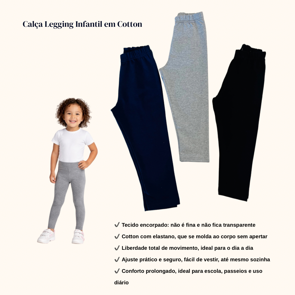 DESCRIÇÃO FINAL PARA O ANÚNCIO A Calça Legging Infantil em Cotton é ideal para o dia a dia das crianças, oferecendo conforto, praticidade e liberdade total de movimento. Perfeita para escola, passeios e uso diário. Destaques do Produto - Tecido encorpado, não é fino e não fica transparente - Cotton com elastano, flexível e confortável - Cintura com elástico, não aperta - Fácil de vestir, ideal até para a criança colocar sozinha - Bainha reforçada, melhor caimento e durabilidade - Uso diário: escola, passeios e lazer - Composição 96% Algodão 4% Elastano - Cores Azul Marinho, Preta e Cinza As cores são enviadas de forma sortida, conforme disponibilidade em estoque. ➡ Caso tenha preferência por alguma cor, informe no campo de observações do pedido. Faremos o possível para atender, porém não garantimos, devido à alta rotatividade de pedidos. Conteúdo da Embalagem Kit com 3 peças conforme a variação escolhida Calça Legging Infantil em Cotton Tabela de Medidas (Medidas aproximadas, sem esticar o tecido) Tam 1: Cintura 18 cm | Comprimento 47 cm Tam 2: Cintura 20 cm | Comprimento 49 cm Tam 3: Cintura 22 cm | Comprimento 51 cm Tam 4: Cintura 24 cm | Comprimento 53 cm Tam 5: Cintura 26 cm | Comprimento 55 cm Tam 6: Cintura 28 cm | Comprito 57 cm Tam 7: Cintura 30 cm | Comprimento 59 cm Tam 8: Cintura 32 cm | Comprimento 61 cm Dica: compare c om uma calça da criança para escolher o tamanho ideal. - Quantidade Kit 3 Peças - Tamanho 1 ao 8 PERGUNTAS FREQUENTES: - As cores são escolhidas? As cores são enviadas de forma sortida. Caso tenha preferência, informe nas observações do pedido que tentaremos atender, conforme disponibilidade. - O tecido é fino? Não. O tecido é encorpado, não fica transparente e é ideal para uso diário. - Pode escolher o tamanho e a quantidade? Sim Basta selecionar o tamanho e o kit desejado (3 ou 6 peças) antes de finalizar a compra.