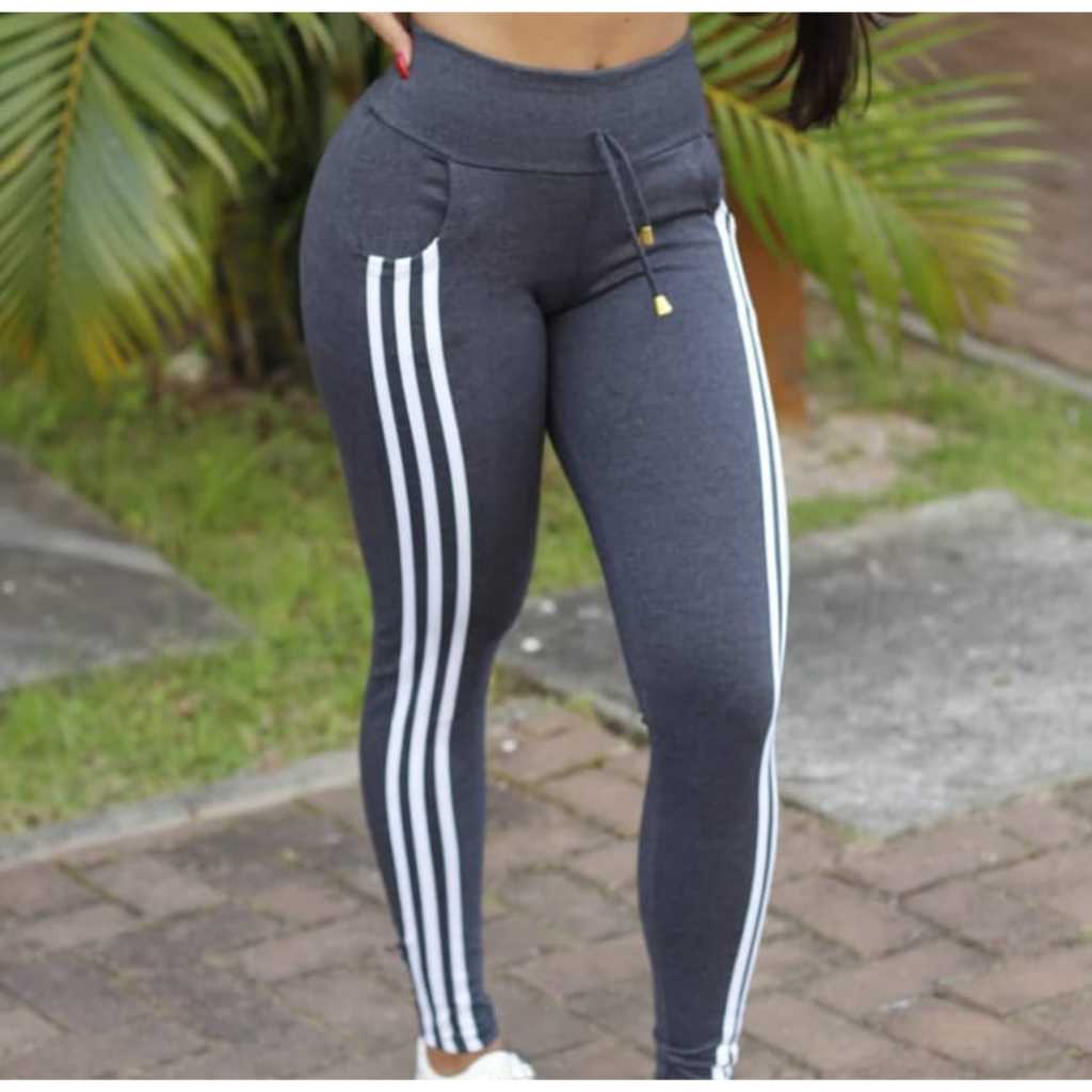 Legging grafite com listras verticais brancas alongadas. - Tecido elástico, ajuste firme e confortável. - Ideal para treino, ida à academia e uso casual.