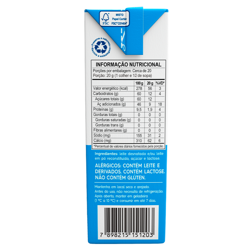 Kit 10 Unidades Leite Condensado Desnatado Light 405g PIracanjuba O Leite Condensado Piracanjuba Light é feito com leite desnatado e ideal para o preparo de vários pratos. O produto é perfeito para compor recheios de bolos, tortas e bombons. A cada 20g, equivalente a uma colher e meia de sopa, são 56kcal e zero gordura. "Por isso, é uma opção mais leve para aqueles momentos de muita doçura. E pode comer de colher, sem culpa!" Com a mesma consistência e performance do leite condensado tradicional, o leite condensado light, atende o público que busca uma alimentação mais equilibrada e sem gordura, mas sem abrir mão dos doces. Mantenha em local seco e arejado. Antes do uso, não necessita de refrigeração. Após aberto, manter em geladeira (1 °C a 10 °C) e consumir em até 7 dias. Ingredientes: leite desnatado, açúcar e lactose. ALÉRGICOS: CONTÉM LEITE. CONTÉM LACTOSE. NÃO CONTÉM GLÚTEN.