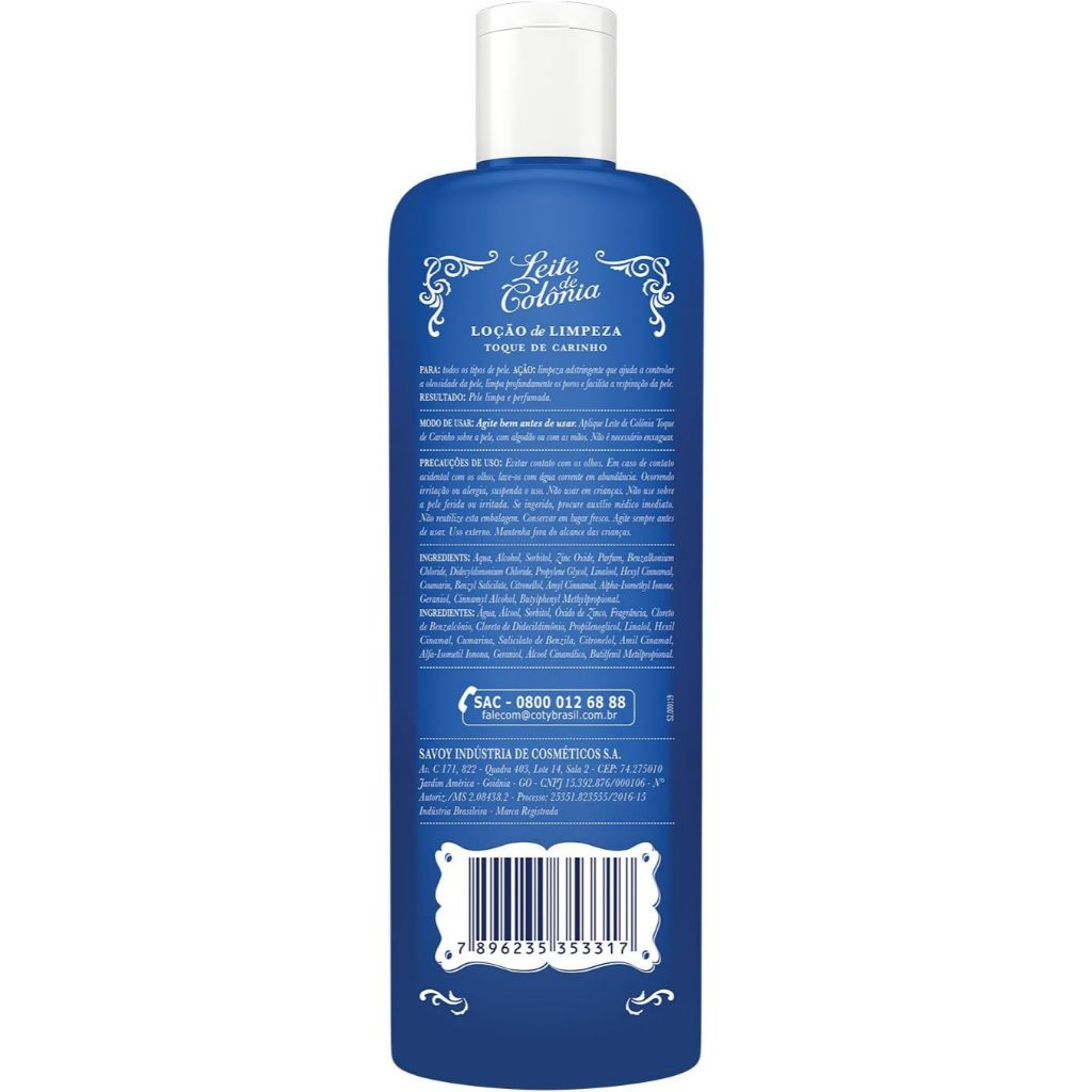 Leite de Colônia Toque de Carinho 200ml – Limpeza e Cuidado para a Sua Pele O Leite de Colônia Toque de Carinho 200ml é um clássico da rotina de cuidados com a pele, reconhecido por sua eficácia na limpeza profunda e sensação de frescor. Desenvolvido para todos os tipos de pele, este produto remove impurezas, resíduos de maquiagem e oleosidade, deixando a pele suave, limpa e perfumada com um toque delicado e nostálgico. ➤ Principais Características: 1. Ação Adstringente Eficiente • Remove profundamente as impurezas da pele, controlando a oleosidade e desobstruindo os poros. 2. Toque Suave e Fragrância Leve • Proporciona uma agradável sensação de frescor com perfume suave e marcante. 3. Fórmula Tradicional com Toque de Carinho • Combina tradição e carinho em uma fórmula que atravessa gerações, ideal para o uso diário. ✔ Benefícios: Limpeza profunda sem agredir a pele Sensação imediata de frescor e bem-estar Reduz a oleosidade e previne o aparecimento de cravos e espinhas Fragrância suave que perfuma delicadamente a pele Pode ser usado no rosto e no corpo ★ Diferenciais do Produto: Produto tradicional, com qualidade reconhecida há décadas Versátil: ideal para o rosto, colo e costas Sensação refrescante após o uso Indicado para homens e mulheres Excelente custo-benefício para o cuidado diário da pele 🔍 Especificações Técnicas: Peso: 200ml Tipo de pele: Todos os tipos Uso: Diário 🧴 Instruções de Uso: Aplique com o auxílio de um algodão sobre a pele limpa e seca, realizando movimentos suaves. Use pela manhã e à noite ou sempre que desejar uma limpeza refrescante. ⚠ Avisos e Precauções: Uso externo Não ingerir Evite contato com os olhos. Em caso de irritação, suspenda o uso e procure orientação médica Mantenha fora do alcance de crianças Conserve em local seco e fresco, longe da luz solar direta 📦 O que está incluso? 1 unidade de Leite de Colônia Toque de Carinho 200ml ---- DÚVIDAS FREQUENTES ---- Os produtos são originais? Sim. Todos os nossos produtos são originais. Emitem nota fiscal? Sim. Emitimos nota fiscal para todos os pedidos.