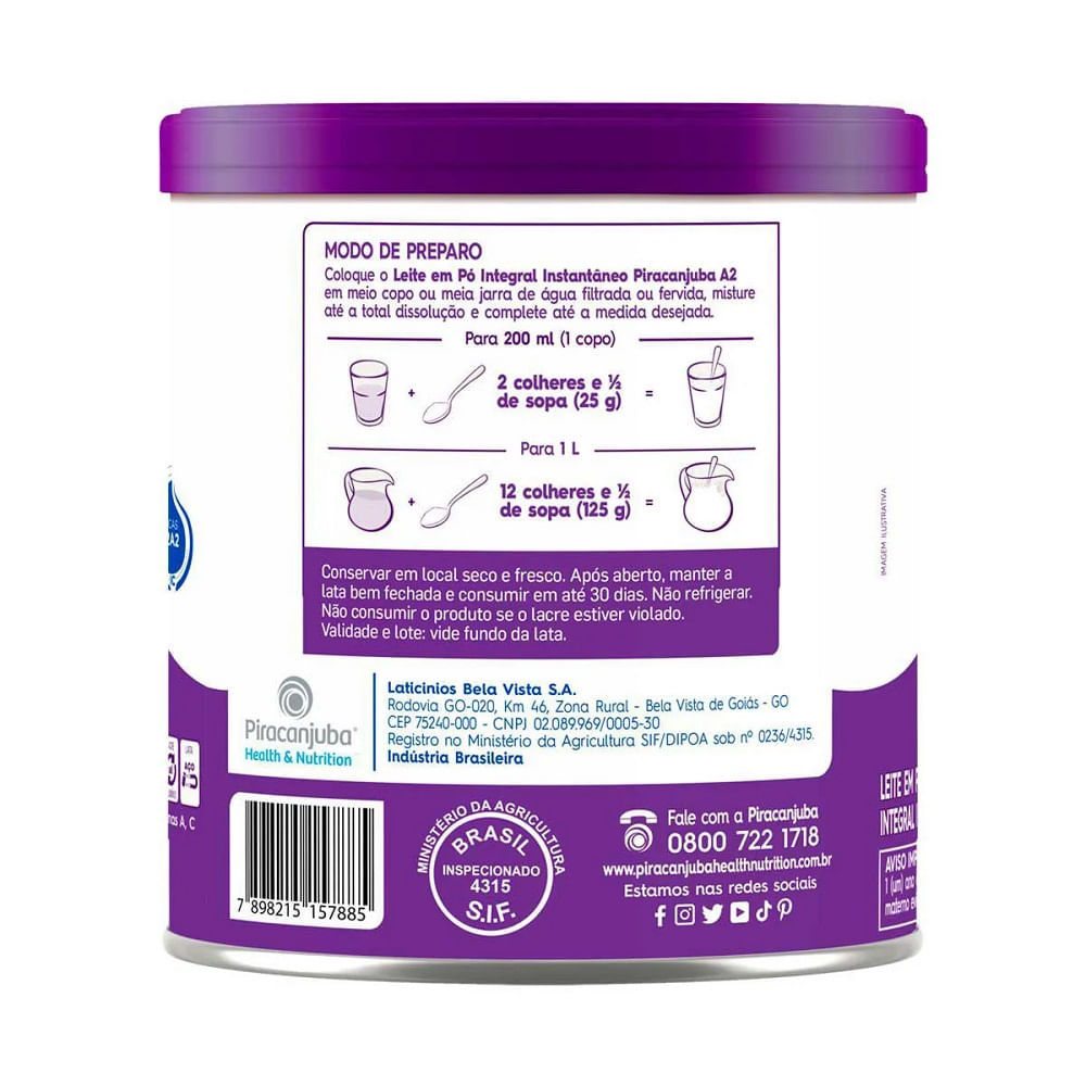 Para que serve o Leite Em Pó Piracanjuba A2 Lata 380g? O Leite Em Pó Piracanjuba A2 Lata 380g é uma opção diferenciada para quem busca uma alternativa de leite mais fácil de digerir. Produzido a partir de vacas selecionadas que produzem apenas a proteína A2, esse leite é ideal para pessoas que sentem desconforto ao consumir leite comum, mas que não têm intolerância à lactose. Rico em nutrientes essenciais como cálcio, proteínas e vitaminas, ele é perfeito para o dia a dia, seja no café da manhã, no preparo de receitas, ou para enriquecer sua alimentação. Como usar o Leite Em Pó Piracanjuba A2 Lata 380g? Para preparar, dissolva 2 colheres de sopa (aproximadamente 20g) de Leite Em Pó Piracanjuba A2 em 1 copo de água morna ou quente (200ml). Misture bem até obter uma bebida homogênea. Pode ser utilizado em substituição ao leite líquido em diversas receitas, como bolos, pudins, molhos, ou mesmo para enriquecer o café e o chá. Composição Leite em pó integral A2, com vitaminas e minerais. Contém a proteína A2, caracterizada por ser mais fácil de digerir. Não contém adição de açúcar ou outros aditivos. Advertências Contém leite. Armazenar em local fresco e seco, protegido da umidade e da luz solar direta. Após aberto, consumir em até 30 dias e manter a lata bem fechada. Principais Benefícios Leite em pó com a proteína A2, mais fácil de digerir Rico em cálcio, proteínas e vitaminas essenciais Ideal para pessoas com sensibilidade ao leite comum Versátil para o preparo de bebidas e receitas Embalagem de 380g, prática e com boa durabilidade Dica Para um leite ainda mais cremoso, utilize água quente ao misturar o Leite Em Pó Piracanjuba A2. Experimente também adicionar a bebida a smoothies, vitaminas ou preparações culinárias para um toque extra de nutrição e sabor.