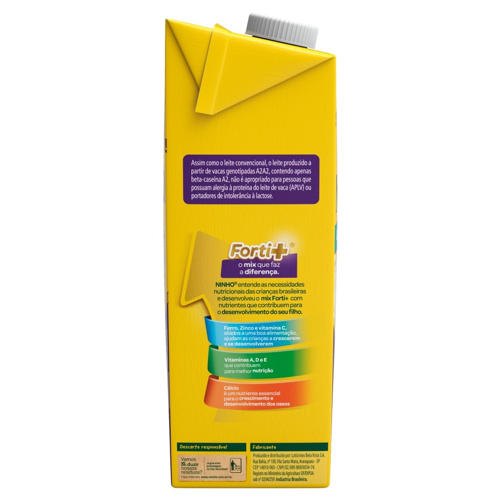 O Leite UHT Ninho A2 é uma versão especial do leite semidesnatado, produzida a partir de vacas genotipadas A2A2, ou seja, que produzem apenas beta-caseína tipo A2, em oposição ao leite convencional, que pode conter mistura de A1 + A2. Essa característica tem sido buscada por pessoas que percebem melhor digestibilidade ou tolerância ao leite, embora não elimine alergias ou intolerância à proteína do leite da vaca (APLV). Antes de aberto: conservar em local fresco, seco e ao abrigo da luz solar direta. Em temperatura ambiente, desde que dentro do prazo de validade. Após aberto: manter refrigerado (geralmente entre 1-10 °C) e consumir dentro de alguns dias, conforme instruções impressas no rótulo do fabricante.