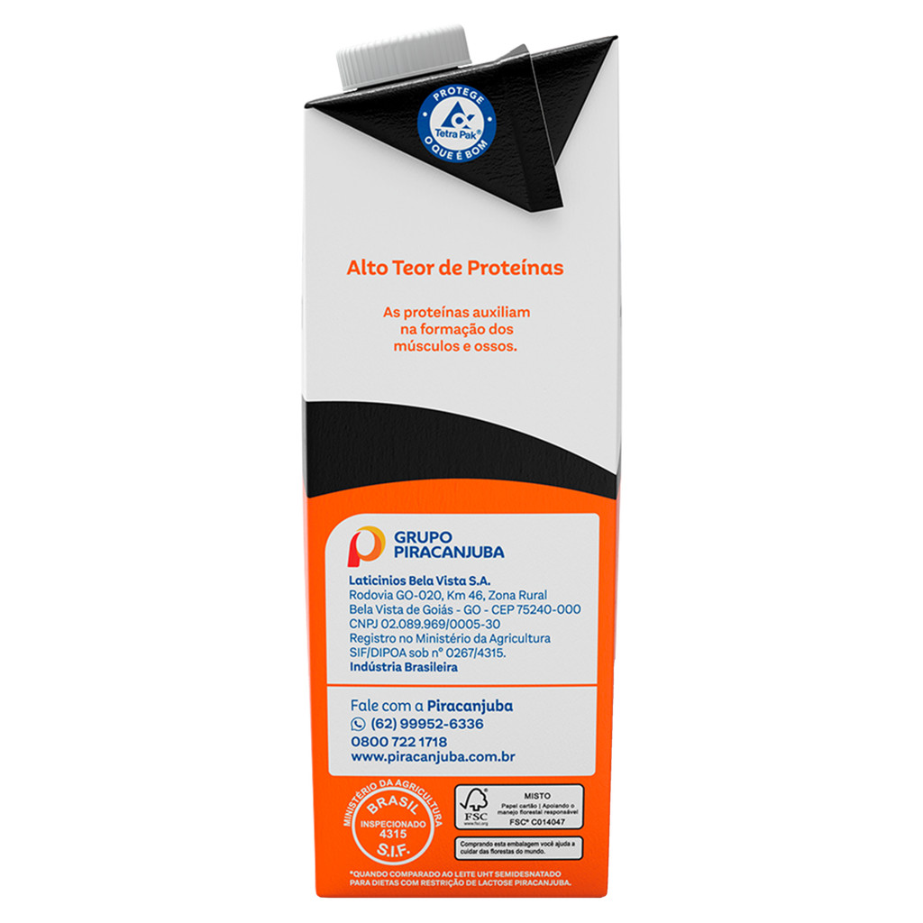 Leite UHT +Protein Piracanjuba 1L – 10g de Proteína por Porção, Zero Lactose O Leite UHT +Protein Piracanjuba é a escolha perfeita para quem busca mais nutrição, praticidade e sabor no dia a dia. Cada porção de 200 ml contém 10g de proteína, fornecendo 50% mais proteínas e 33% mais cálcio em comparação ao leite comum, ajudando na manutenção da massa muscular, saúde óssea e energia para a rotina. Além de ser Zero Lactose, é ideal para pessoas com restrição alimentar, sem abrir mão do sabor e dos nutrientes do leite. Produzido com leite semidesnatado, combina leveza, cremosidade e valor nutricional elevado, sendo uma excelente opção para consumo puro, no café, com cereais, vitaminas, ou até mesmo no preparo de receitas saudáveis. O processo UHT garante mais segurança e maior conservação, sem necessidade de refrigeração antes de aberto. Diferenciais e Benefícios ✅ 10g de proteína por porção (200ml) – nutrição para músculos e energia. ✅ Zero Lactose – indicado para intolerantes e sensíveis à lactose. ✅ 50% mais proteínas que o leite comum. ✅ 33% mais cálcio – essencial para ossos e dentes fortes. ✅ Leite semidesnatado – equilíbrio entre sabor e leveza. ✅ Processo UHT – maior segurança e durabilidade, sem conservantes. ✅ Embalagem de 1L – prática e econômica para toda a família. Informações do Produto Marca: Piracanjuba Produto: Leite UHT Semidesnatado +Protein Zero Lactose Volume: 1 litro Proteínas: 10g por porção (200 ml) Cálcio: 33% mais em relação ao leite convencional Gordura: semidesnatado (teor reduzido) Zero Lactose Não contém glúten Armazenamento: Conservar em local fresco e arejado. Após aberto, manter refrigerado entre 1 °C e 10 °C e consumir em até 3 dias. Informações para Alérgicos Contém leite e derivados. Não contém glúten. 👉 O Leite UHT +Protein 10g Piracanjuba 1L é ideal para quem busca nutrição reforçada, mais proteínas e cálcio, sem lactose, acompanhando sua rotina de cuidados com a saúde e bem-estar.