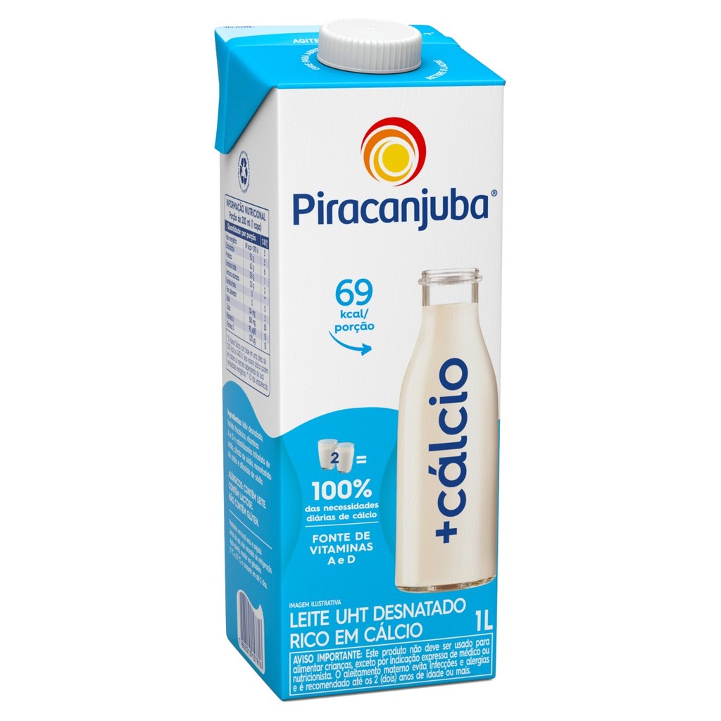 🥛 Leite UHT Desnatado +Cálcio Piracanjuba 1L O Leite UHT Desnatado +Cálcio Piracanjuba 1L foi desenvolvido para quem busca mais saúde, nutrição e equilíbrio na alimentação do dia a dia. Com tecnologia UHT (Ultra High Temperature), o leite passa por um processo que garante segurança alimentar e maior conservação, preservando o sabor e os nutrientes essenciais. Esse leite é rico em cálcio, fornecendo 100% da necessidade diária recomendada do mineral em apenas 2 copos, o que contribui para ossos e dentes mais fortes e para a prevenção da osteoporose. Além disso, é fonte das Vitaminas A e D, que atuam no fortalecimento do sistema imunológico, visão, absorção do cálcio e manutenção da saúde óssea. Com apenas 69 kcal por porção, é uma opção nutritiva, leve e ideal para quem deseja manter uma alimentação saudável sem abrir mão do sabor. ✅ Benefícios do Leite UHT +Cálcio Piracanjuba: Fonte de Vitaminas A e D. 100% das necessidades diárias de cálcio em apenas 2 copos. Auxilia na manutenção da saúde dos ossos e dentes. Apenas 69 kcal por porção, ideal para dietas equilibradas. Leite desnatado, com menos gordura e mais leveza. Pronto para beber e prático para o dia a dia. 📦 Informações do Produto: Produto: Leite UHT Desnatado +Cálcio Marca: Piracanjuba Volume: 1 litro Categoria: Leite UHT (longa vida) Nutrientes principais: Cálcio, Vitaminas A e D Armazenamento: Conservar em local fresco e arejado. Após aberto, manter refrigerado e consumir em até 3 dias. ⚠️ Aviso Importante: Este produto não deve ser usado para alimentar crianças menores de 1 ano de idade, exceto sob orientação de médico ou nutricionista. O aleitamento materno evita infecções e alergias e é recomendado até os 2 anos de idade ou mais.