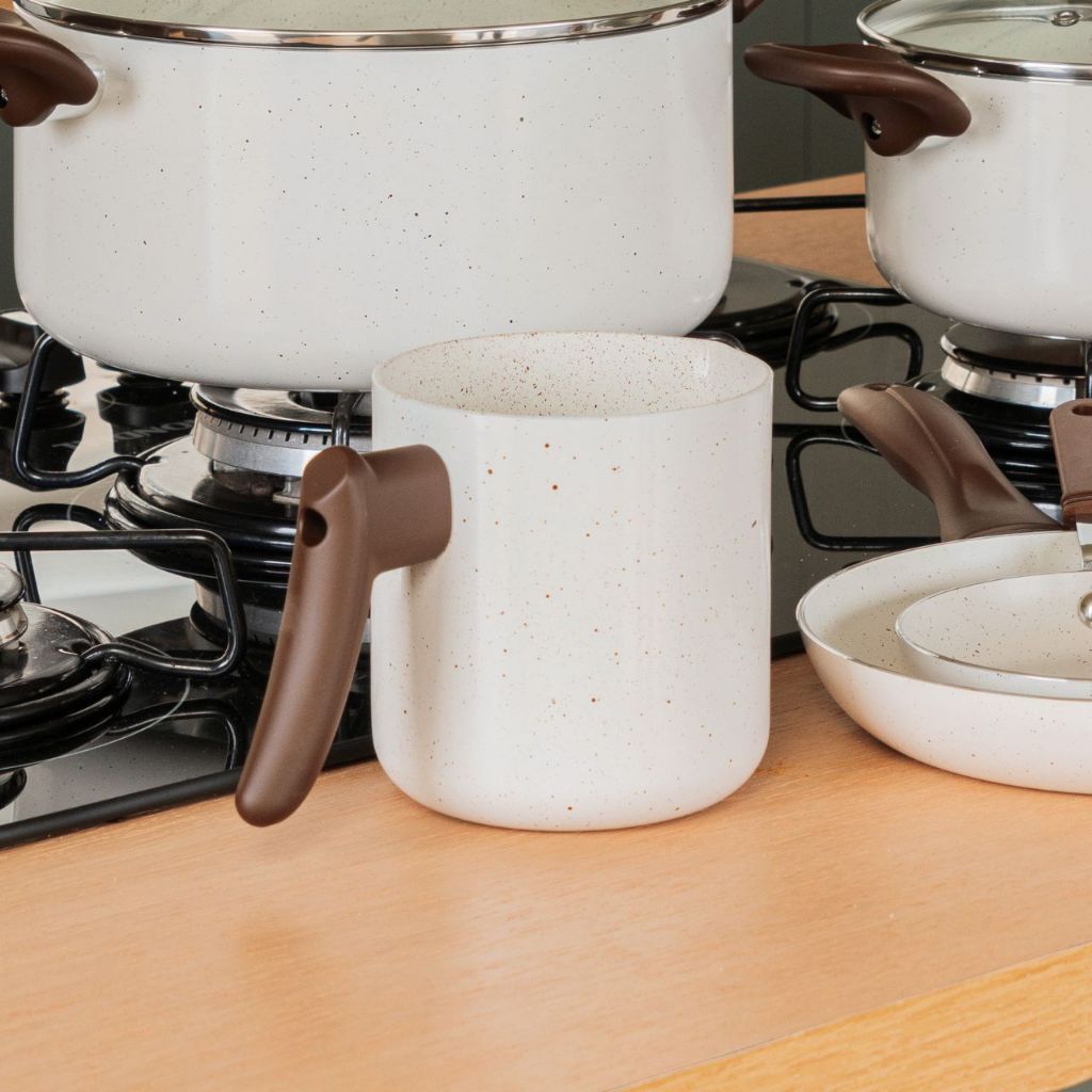 Transforme sua cozinha com o Fervedor Brinox Ceramic Life Smart Plus Vanilla, a escolha ideal para quem busca qualidade, tecnologia e um design sofisticado. Com revestimento cerâmico antiaderente, evita que o leite e outros alimentos grudem, garantindo uma limpeza muito mais fácil. Perfeito para quem deseja praticidade no dia a dia. A Linha Ceramic Life conta com a tecnologia Pro Ceramic, que proporciona antiaderência superior e mais resistência. Além disso, é livre de PFOA, tornando-se uma opção mais segura para a sua saúde e mais sustentável para o meio ambiente. Compatível com todos os tipos de fogões, incluindo cooktop de indução, é fabricado em alumínio de alta qualidade, garantindo um aquecimento rápido e uniforme, reduzindo tempo e consumo de energia. O design moderno se destaca pelo acabamento na exclusiva cor Vanilla, um tom de bege claro com efeito marmorizado, que é neutro e sofisticado ao mesmo tempo, combinando com vários estilos de cozinha. Já o cabo na cor marrom possui toque macio e tecnologia antitérmica, proporcionando mais segurança e conforto no manuseio. Se você procura um fervedor cerâmico que alia inovação, resistência e elegância, essa é a escolha certa. Aqueça líquidos com mais eficiência e leve mais praticidade para o seu dia a dia.