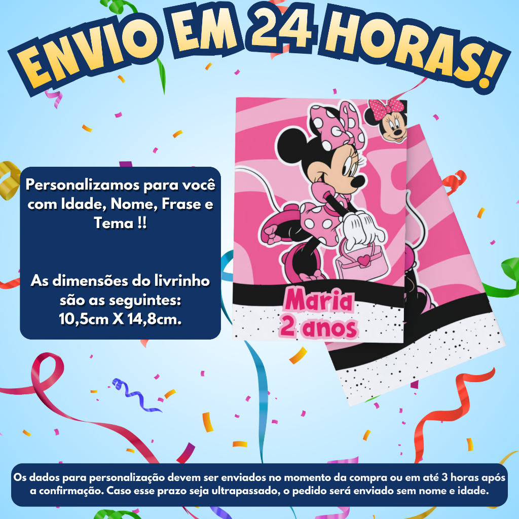 O livrinho já chega prontinho para usar, contendo 8 páginas cheias de desenhos para a criançada se divertir pintando. 😍 🚨 ALERTA MÁXIMO SOBRE A PERSONALIZAÇÃO 🚨 Não queremos que você receba o produto diferente do sonhado! Por isso: 👉 Você tem 3 HORAS após a compra para nos enviar pelo Chat da Shopee: Nome e Idade. ⛔ Atenção: Se passar desse prazo, precisaremos enviar o produto em 24h sem o nome e a idade, contendo apenas o desenho do tema. Não deixe de enviar! Passo a Passo da Compra Perfeita: 1️⃣ Feche o pedido. 2️⃣ Corra no Chat da Shopee e mande os dados. 3️⃣ Pronto! Agora é só esperar suas lembrancinhas chegarem para surpreender a todos! 🎈 Compre > Acesse o Chat > Envie Nome/Idade > Receba um produto feito para encantar! 🌟 ATENÇÃO: ENVIAMOS EM 24 HORAS EM DIAS ÚTEIS. INFORMAÇÃO LEGAL: PRODUTOS PERSONALIZADOS Em conformidade com o Código de Defesa do Consumidor, informamos que produtos personalizados sob encomenda não estão sujeitos a troca ou devolução por arrependimento, visto que são produzidos exclusivamente para o cliente e não possuem valor comercial para terceiros. A troca será realizada apenas se: O produto apresentar defeito de fabricação; Houver erro na personalização cometido por nossa equipe (diferente do aprovado pelo cliente).