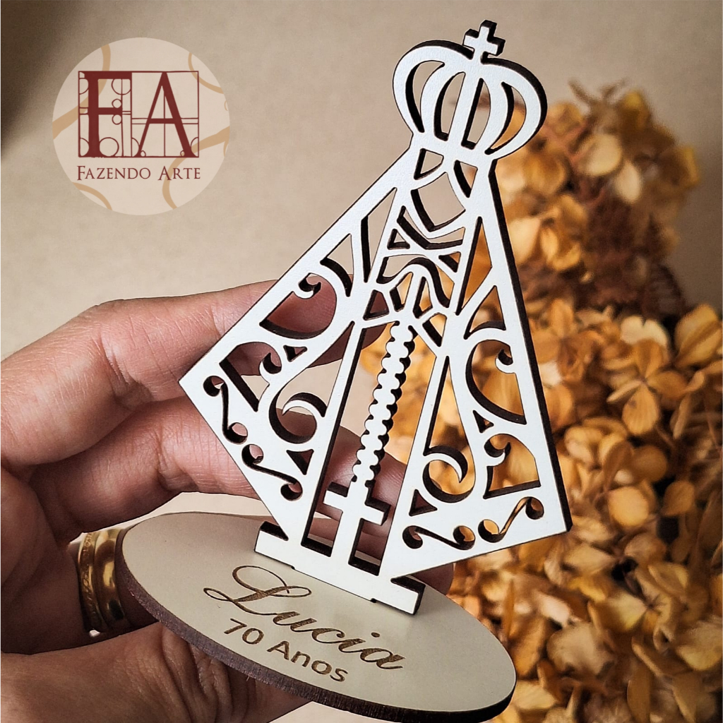 Lembrancinhas para encantar e emocionar Kit de Lembrancinhas em MDF branco É possivel personalizar com o nome e também com a data do evento. Medida: 8cm de altura aproximadamente Largura: 7cm Altura : 10,5cm Comprimento : 4cm Para agilizarmos o seu pedido, favor informar após a compra, por mensagem no chat do shopee, o nome e a data (à sua escolha) que deverá ser gravado. Prazo de fabricação: 01 dia útil MDF branco de 3mm Cada peça é composta por imagem da Nsa Aparecida + base de sustentação, personalizada. O conjunto é enviado desmontado, para fixação final com uso de cola branca ou cola instantânea. Tarefa de fácil execução, dispensando manual de orientação.