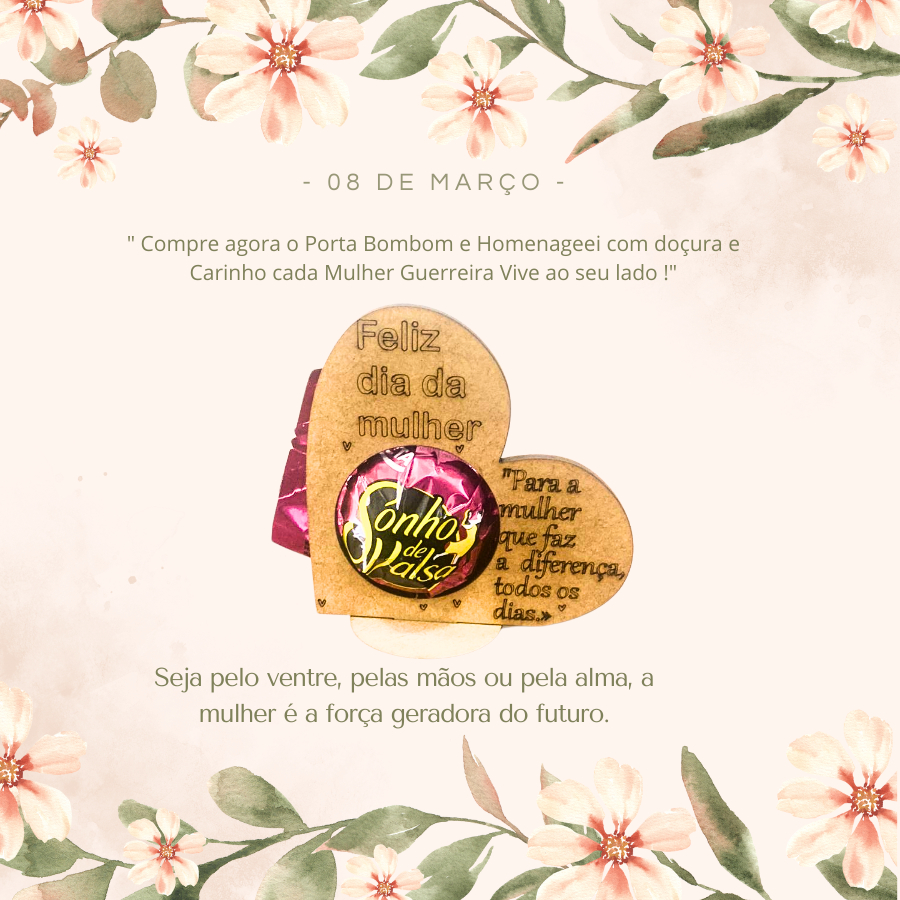 Porta Bombom MDF – Presente Especial para o Dia das Mães e Dia da Mulher ❤️ Celebre o Dia das Mães ou o Dia da Mulher com um presente único e cheio de significado! O Porta Bombom MDF em formato de coração é a opção perfeita para expressar seu carinho e reconhecimento. Com as mensagens "Feliz Dia da Mulher" e "Para a mulher que faz a diferença todos os dias" gravadas, este porta bombom é uma verdadeira homenagem às mulheres especiais da sua vida. E o melhor de tudo: no centro do coração, há um espaço dedicado para encaixar um delicioso bombom, tornando o presente ainda mais doce e especial. ------------------------------------ MEDIDAS DO PRODUTO: - 8 CM de cumprimento. - 8 CM de altura. - 4 cm Circunferência - MATERIAL: MDF 3mm ------------------------------------ **ATENÇÃO! OBSERVAÇÕES: - Não acompanha bombom - A tonalidade da cor do produto pode variar de acordo com a resolução da tela - O produto é enviado desmontado para evitar danos durante o transporte e reduzir o custo do frete! - Montagem simples e de encaixe; (se achar necessário usar cola branca de boa qualidade, não acompanha) - Cuidados especiais: Não deixar em contato direto com a água, limpar somente com um pano levemente umedecido. - Utilize fita para fixar o bombom se necessário !! ------------------------------------ Surpreenda a mulher incrível da sua vida com um presente que combina amor, carinho e sabor! Adquira agora o Porta Bombom MDF e faça o Dia das Mães ou o Dia da Mulher ainda mais especial! Compre agora com frete rápido e seguro e garanta um presente inesquecível para quem faz a diferença todos os dias!