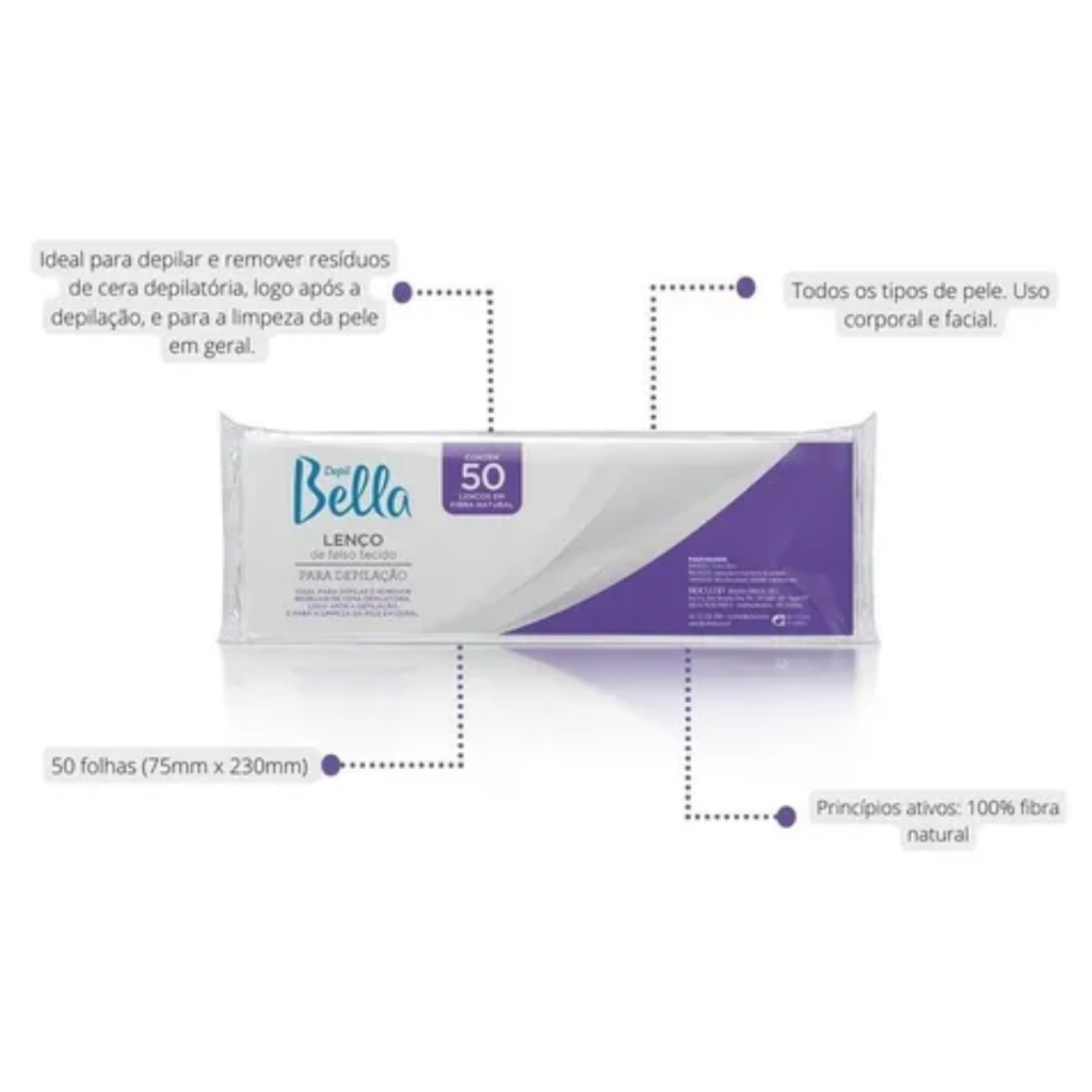 Lenço de Falso Tecido Para Depilação 50 fls Depil Bella, ideal para depilar e remover resíduos de cera depilatória, logo após a depilação, e para a limpeza da pele em geral. Embalagem: 50 folhas (75mm x 230mm) - 100% fibra natural. Depilação com lenços, praticidade e eficiência.
