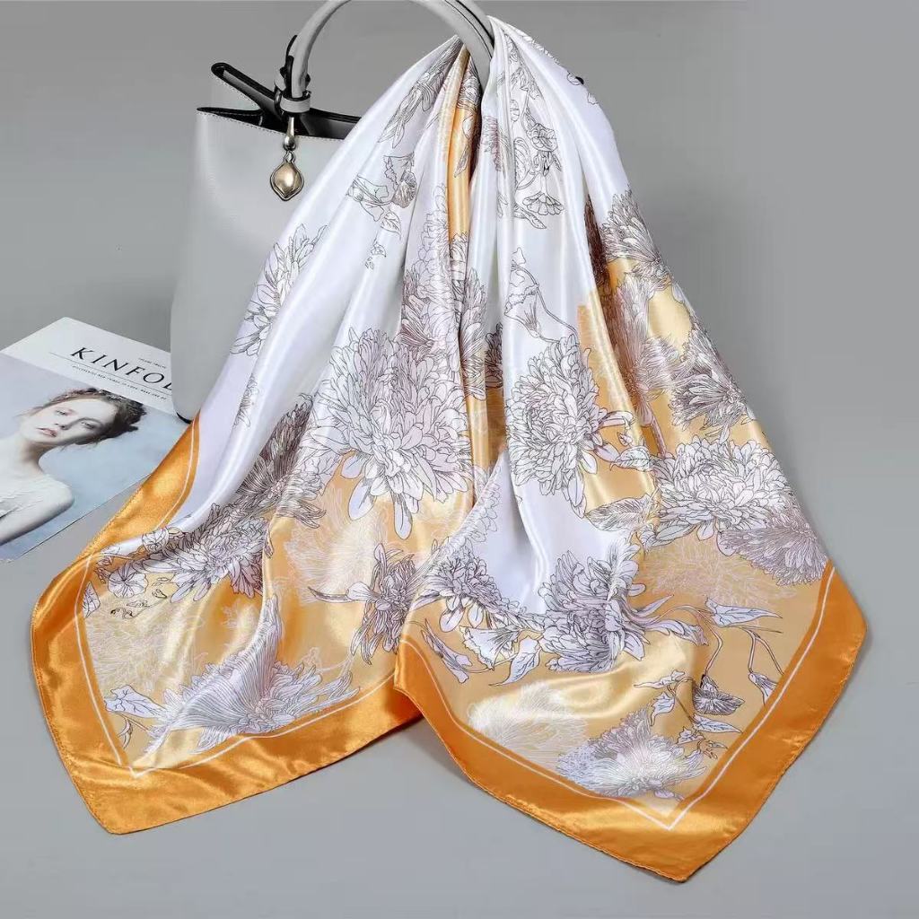 Lenço de seda com estampa de crisântemo, 90x90 cm, ideal para praia, luxuoso e confortável, pode ser usado como xale.