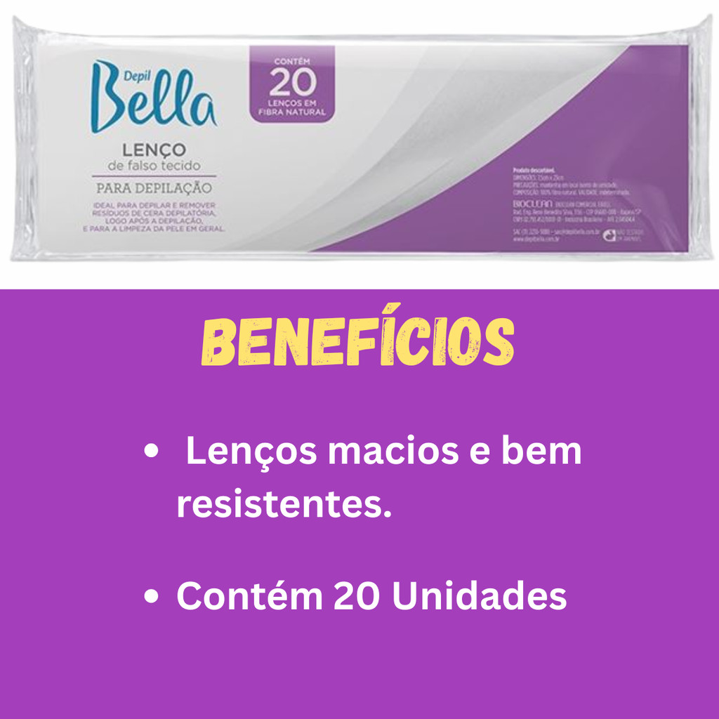 Lenço Depil Bella – 20 Unidades O Lenço Depil Bella Gran Style, feito em falso tecido de fibra natural, é ideal para: ✔ Remover resíduos de cera depilatória logo após a depilação ✔ Auxiliar na limpeza da pele em geral ✔ Proporcionar suavidade e praticidade no uso ✨ Composição: 100% fibra natural 📏 Dimensões: 7,5cm x 23cm 🗑 Produto descartável 📦 Conteúdo: 1 kit com 20 lenços ⚠️ Precauções: Manter em local seco e livre de umidade Validade: indeterminada 🔎 Resultado: remoção total dos resíduos de cera depilatória, deixando a pele limpa e macia quando utilizado corretamente.