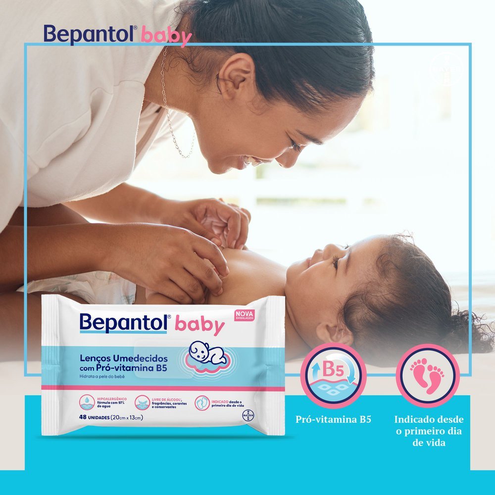 Len?o Umedecido Bepantol Baby 48 unidadesOs Lenço Umedecido Bepantol Baby 48 unidades são super macias e possuem um toque leve, como o de algodão, para uma higiene suave e agradável. Sua fórmula conta com pro vitaminas B5 que hidrata a pele de dentro para fora, auxiliando na prevenção de assaduras. Ela é dermatologicamente testadas e não contém sabão ou álcool em sua composição, proporcionando assim toda a segurança necessária para você cuidar do seu bebê. São perfeitas para serem levadas na bolsa de itens para o bebê, seja em casa ou em um passeio.