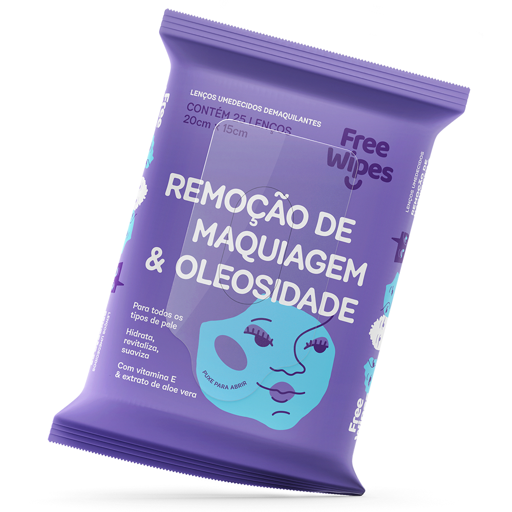 Free Wipes é uma linha de lenços umedecidos em diferentes versões para diversas ocasiões e necessidades. Seja para o rosto, para as mãos, depois do Nº2 ou para a higiene íntima feminina, Free Wipes facilita o seu dia a dia para vice manter a sua rotina Free. Os lenços umedecidos DEMAQUILANTES Free Wipes ajudam na remoção da maquiagem e na redução da oleosidade do rosto. DIFERENCIAIS: - Remove a maquiagem e ajuda no controle da oleosidade. - Embalagem prática e econômica com 25 lenços. - Ideal para todos os tipo de pele do rosto. - Hidrata, revitaliza e suaviza a pele. - Contém vitamina E & extrato de aloe vera. - Sem álcool etílico. - Dermatologicamente testado. MODO DE USO: Abra a etiqueta autoadesiva no local indicado. Retire o lenço puxando pelo centro. Passe nas áreas que deseja limpar e/ou remover a maquiagem. Utilize para retirar a maquiagem do rosto, inclusive da região das pálpebras, com movimentos suaves. Após o uso, feche a etiqueta autoadesiva para conservar a umidade dos lenços. PRECAUÇÕES: Uso externo. Não ingerir. Manter o produto fora do alcance de crianças. Caso tenha hipersensibilidade a algum componente da fórmula ou pele irritada, não utilize o produto. Havendo irritação, suspensa o uso e procure orientação médica.