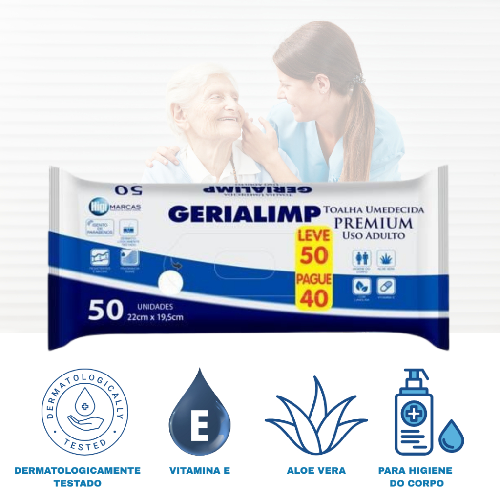 Lenço Umedecido Geriátrico Adulto Premium Gerialimp - 15 pacotes com o total de 750 unidades (22x19,5cm) Ideal para cuidados com idosos, pós-operatório, acamados e higiene pessoal. Extra macia, resistente e super absorvente Possui extrato de Aloe Vera e Vitamina E Pronta para uso – não precisa enxaguar! Descrição do Produto: A Toalha Geriátrica Gerialimp da Higimarcas é a solução prática e eficaz para quem busca conforto, segurança e praticidade no cuidado diário com a higiene pessoal. Especialmente desenvolvida para o público geriátrico, pessoas com mobilidade reduzida ou acamadas. Cada embalagem contém 50 unidades de toalhas úmidas com fórmula suave, dermatologicamente testada, livre de álcool e com agradável fragrância. Benefícios: Dermatologicamente testada – segura para todos os tipos de pele Dispensa enxágue – mais praticidade no cuidado diário Hidrata e limpa ao mesmo tempo Indicada para higiene íntima e corporal Perfeita para uso hospitalar, domiciliar ou em clínicas O que você está comprando: 15 pacotes com 50 toalhas geriátricas Gerialimp (total de 750 toalhas). Marca: Higimarcas Dimensão da toalha: 22cm x 19,5cm Envio Imediato! Produtos à pronta entrega Perguntas Frequentes: É indicado para banho no leito? Sim! A toalha é perfeita para esse tipo de uso, substituindo o banho tradicional com segurança e eficácia. Compre agora e garanta o melhor cuidado para quem você ama!