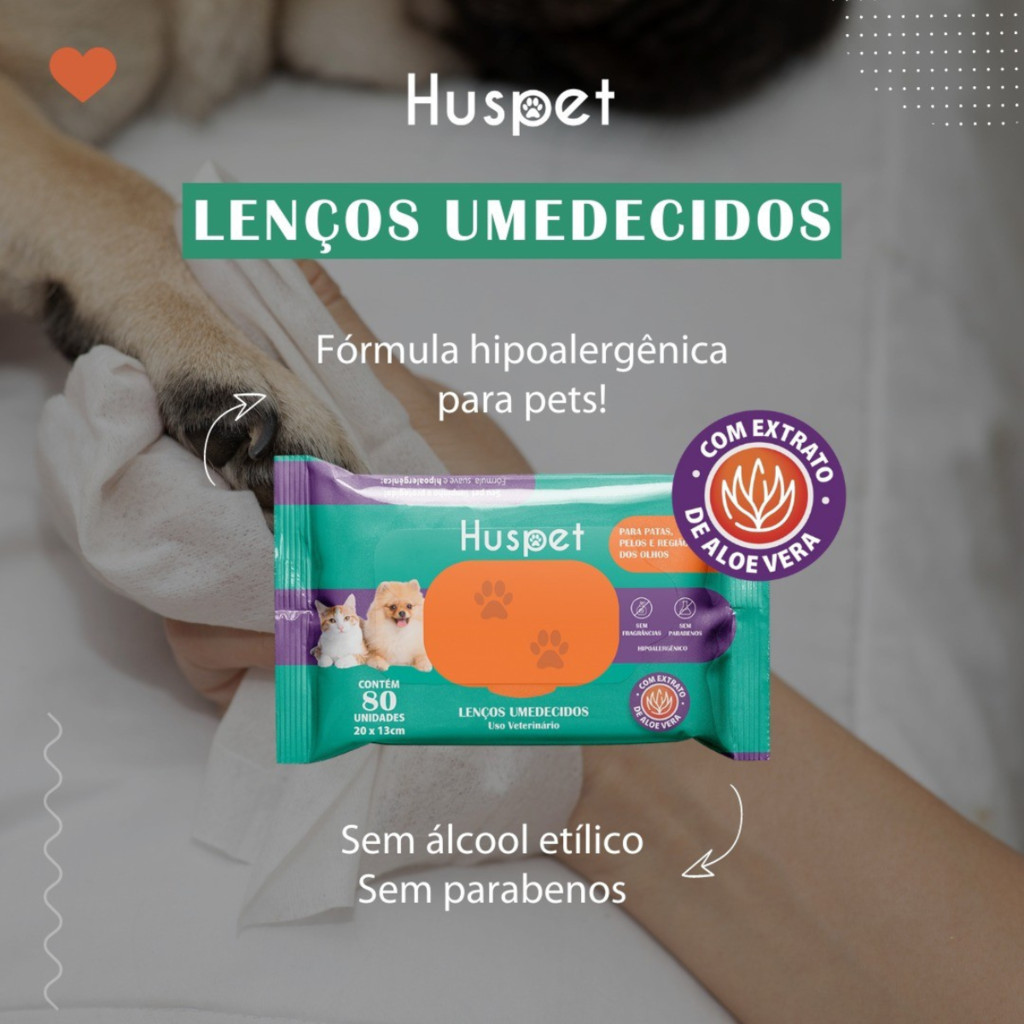 ****************************** COMBO COM 3 UNIDADES ****************************** Conheça oLenço Umedecido Huspet 80 und, o cuidado delicado que seu cão ou gato merece! Desenvolvido especialmente para a higienização dos pelos, patas e região dos olhos, este lenço é hipoalergênico e possui componentes com alto poder de hidratação, garantindo que a pele do seu pet não seja agredida. Ideal para manter seu amiguinho sempre limpo e confortável, o Lenço Umedecido Huspet promove o bem-estar diário com praticidade e segurança. Sua fórmula suave previne alergias, tornando-o perfeito para todos os tipos de pelagem e peles sensíveis. Dê ao seu pet todo o carinho que ele merece com uma limpeza eficaz, rápida e sem irritações. Experimente o Lenço Umedecido Huspet e transforme o cuidado diário em um momento de puro afeto e proteção!