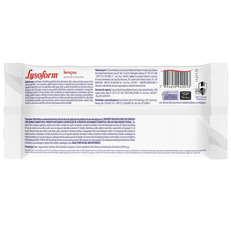 Lenço Umedecido Lysoform é um produto versátil, que mata 99.9% dos vírus, bactérias e fungos, incluindo o vírus que pode causar a COVID-19 (SARS-CoV-2). Ideal para desinfetar e eliminar odores de diversas superfícies, para que você possa aproveitar todos os momentos. Fácil de carregar para todas as ocasiões. Beneficios: • Eficaz contra o SARS-COV 2. • Mantém a casa limpa no cotidiano. • Dispensa o uso de balde, produtos de limpeza, esponja, panos e água. • Torna a sua rotina mais versátil e funcional, deixando a sua casa com cheirinho de limpeza. • Fragrância original. • Disponível com 36 unidades cada embalagem.